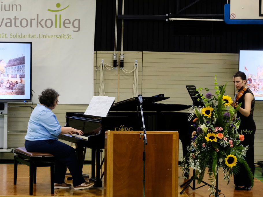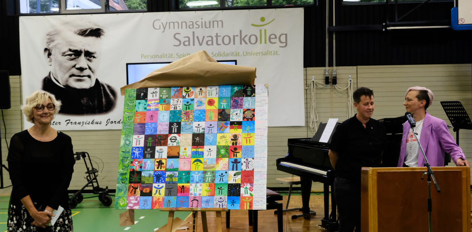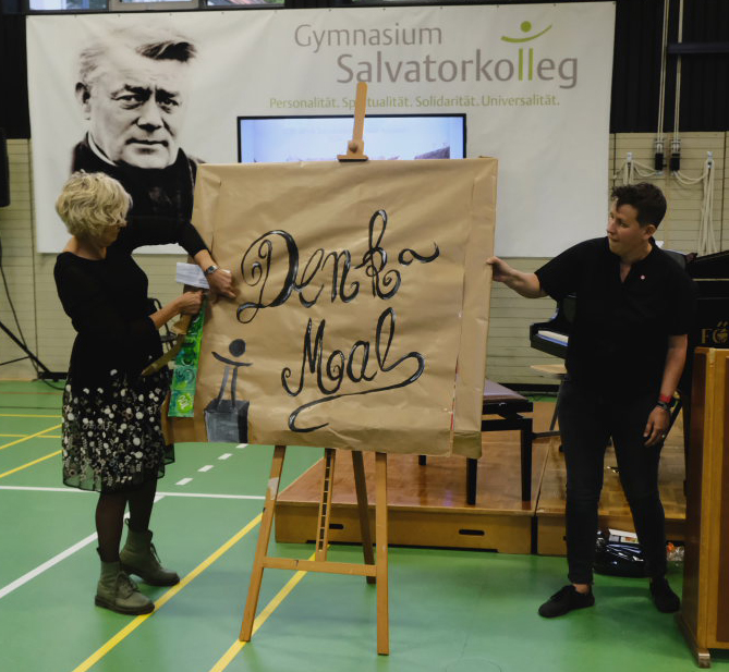 Doch bevor nach der musikalischen Einleitung der Feier, dem Violinkonzert G-Dur von Antonio Vivaldi, gespielt von Christine Braig am Flügel und Elise Kazmaier mit ihrer Violine, sowie der Begrüßung durch den Schulleiter der Provinzial der Salvatorianer Pater Friedrich Emde sein Grußwort beginnen konnte, hatten der Elternbeiratsvorstand gemeinsam mit Kunstlehrerin Uta Schubert noch eine Überraschung parat. Sie enthüllten ihr „Denk Mal“, auf dem sich 100 Schüler künstlerisch mit ihrer Interpretation des Schullogos verewigt hatten.