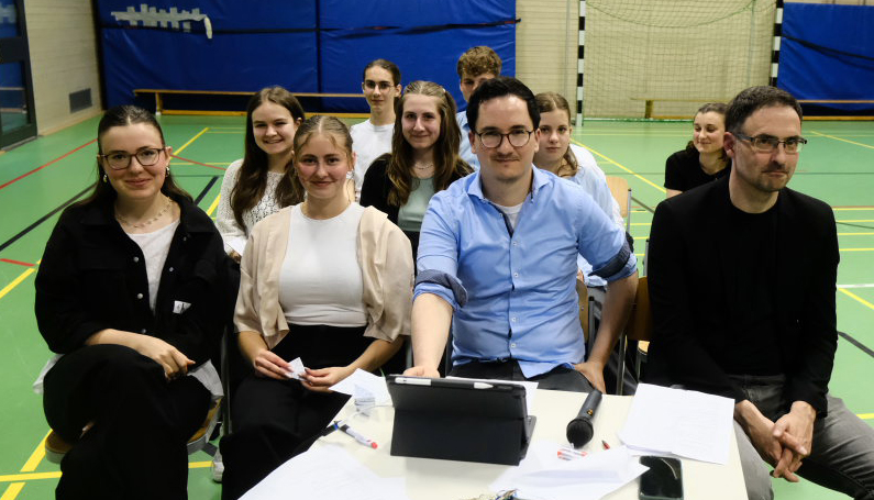 Viele Infos zur Geschichte der Schule: Schüler/innen des Leistungsfaches Geschichte der Kursstufe 1 (Klasse 11) mit Christoph Sigg. Rechts Konrektor Frank Schmuck.