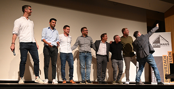 28. Juli 2023: Unser Reporter Erwin Linder schlagzeilt: „Rieseninteresse an der neuen Kurhausgenossenschaft in Bad Wurzach“. Erwin Linder hat damals dieses Bild gemacht. Es zeigt den renommierten Moderator Johannes Warth (rechts), wie dieser ein Selfie mit den sieben Genossenschaftsgründern macht. Auf der Bühne des Kurhauses zu sehen sind (von links): Bernhard Schad, Dr. Stefan Fimpel, Christoph Gschwind, Manuel Pfender, Christian Gindele, Hermann Haas, Sascha Dargel und, mit dem Rücken zum Betrachter, Johannes Warth. Foto: Erwin Linder