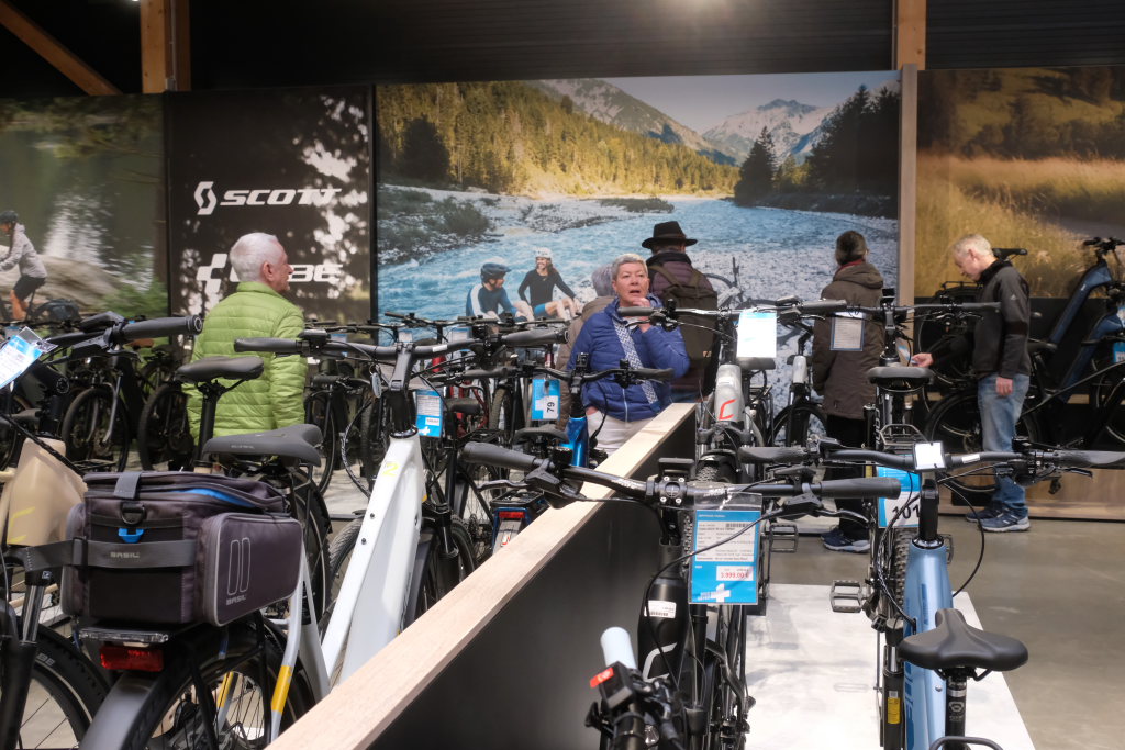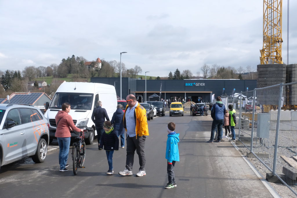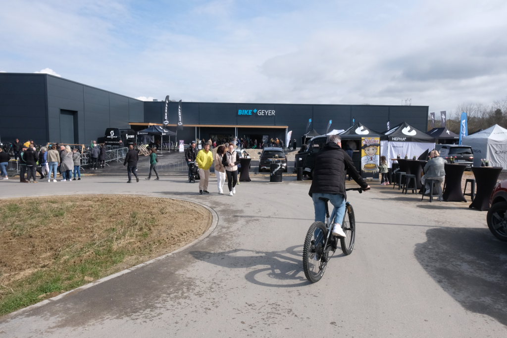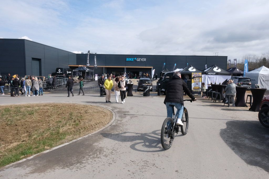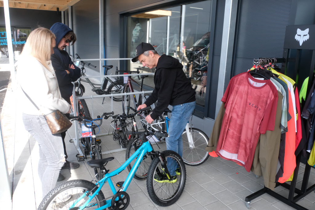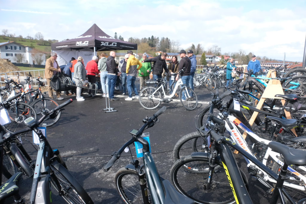 Bereits am Morgen pilgerten viele Besucher zu einem der Brennpunkte, zur offiziellen Eröffnungsmesse bei Bike+ Geyer in der Ziegelwiese. Auch zum Gebrauchtrad-Flohmarkt des Skiclubs. Mit dabei war auch Optik-Westermayer, das einen Sportbrillentest durchführte, und im extra aufgestellten Festzelt spielte die Musikkapelle Eggmannsried beim Frühschoppen auf.