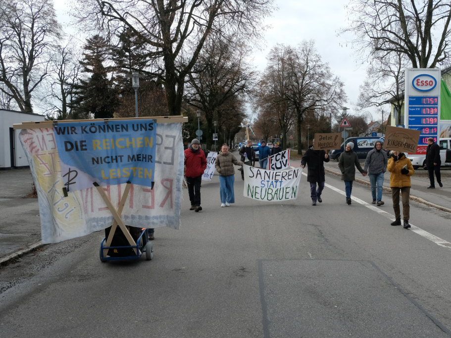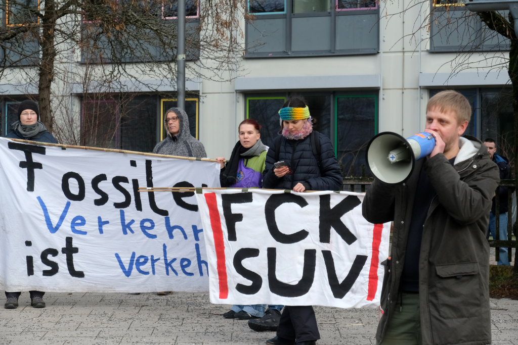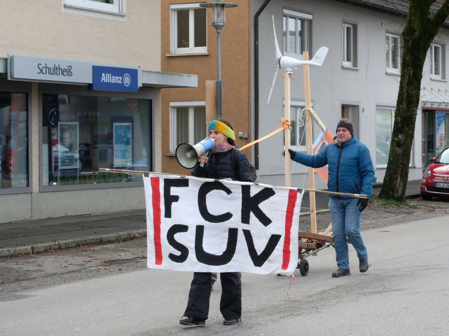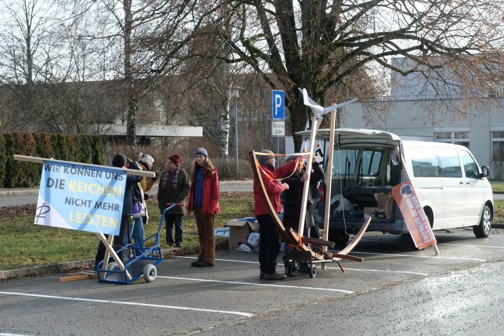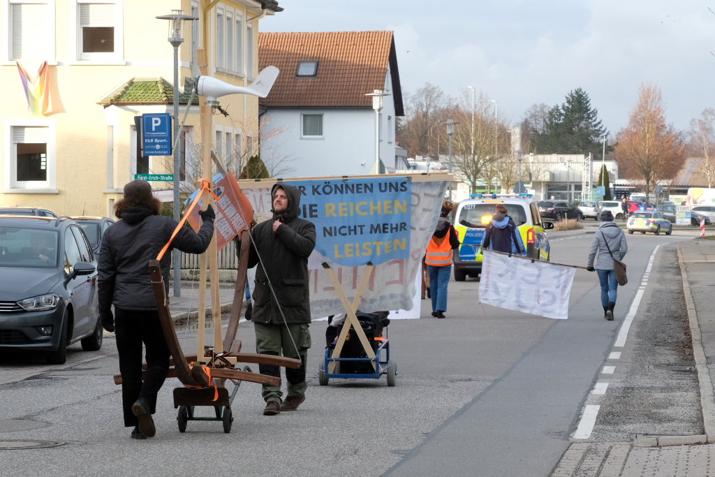 Am Postplatz erläuterte Lukas Häfele zunächst, wie er zu dem Titel „Hitzefrei “ jetzt mitten im Dezember gekommen war: „Wir haben viele heiße Rekordsommer nacheinander gehabt und es werden noch viele folgen“, sagte er vorab. Unsere Gesellschaft sei auf Wirtschaftswachstum „gepolt“, „aber die Ressourcen dieser Erde sind endlich.“ Das Mehr-höher-weiter-Prinzip habe vielleicht die letzten 50 Jahre funktioniert, „aber es geht nicht an, dass man auch jetzt noch immer größere Autos und Wohnungen kauft.“ Und nahm damit Bezug auf ein mitgeführtes Transparent: „Wir können uns die Reichen nicht mehr leisten!“