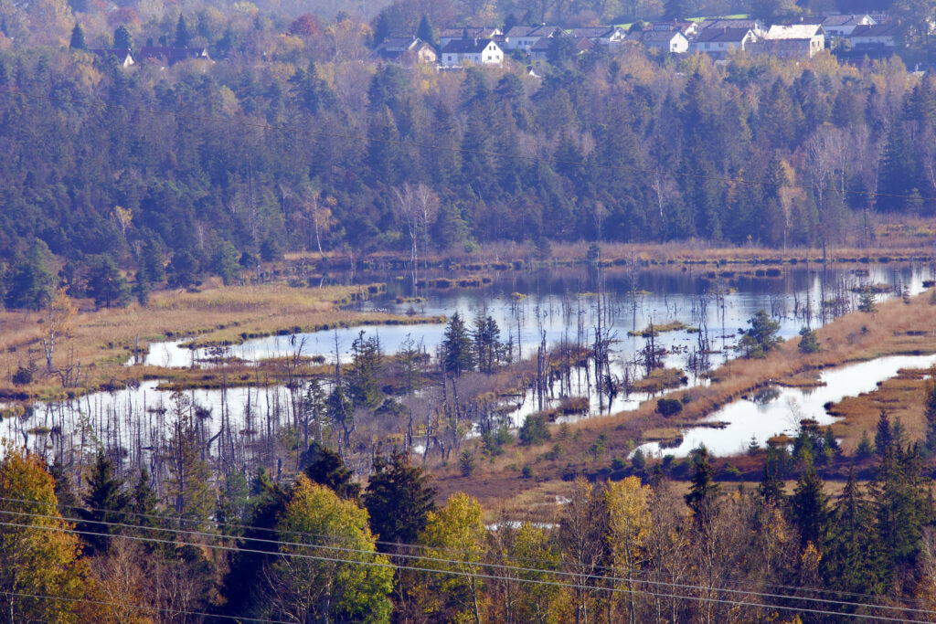 Wer das Ried von dort betrachten will, bleibt, von Wengen kommend, vor der wieder aufgeforsteten Waldfläche stehen und hat einen umfassenden Ausblick auf das Wurzacher Ried. Selbst mit bloßem Auge lassen sich die unterschiedlichen Moorbereiche ohne Probleme unterscheiden. Und das kostenlos. Dies ist im Übrigen auch ein beliebter Standort ortskundiger Ornithologen, die beispielsweise von dort die Brut und Aufzucht der Kraniche beobachten.
