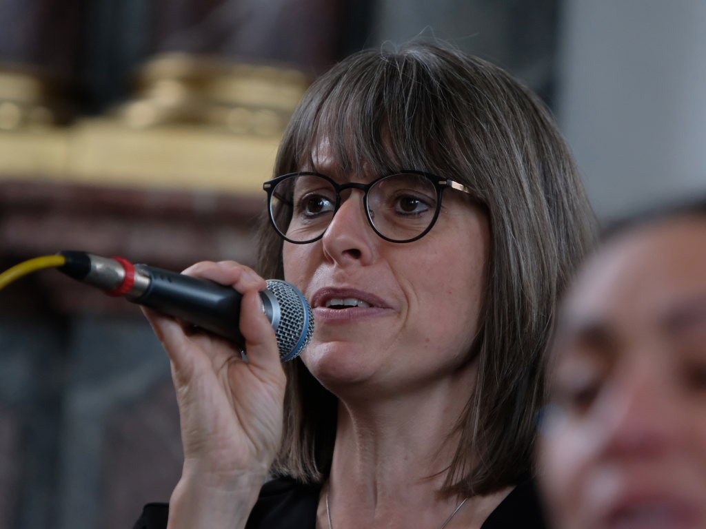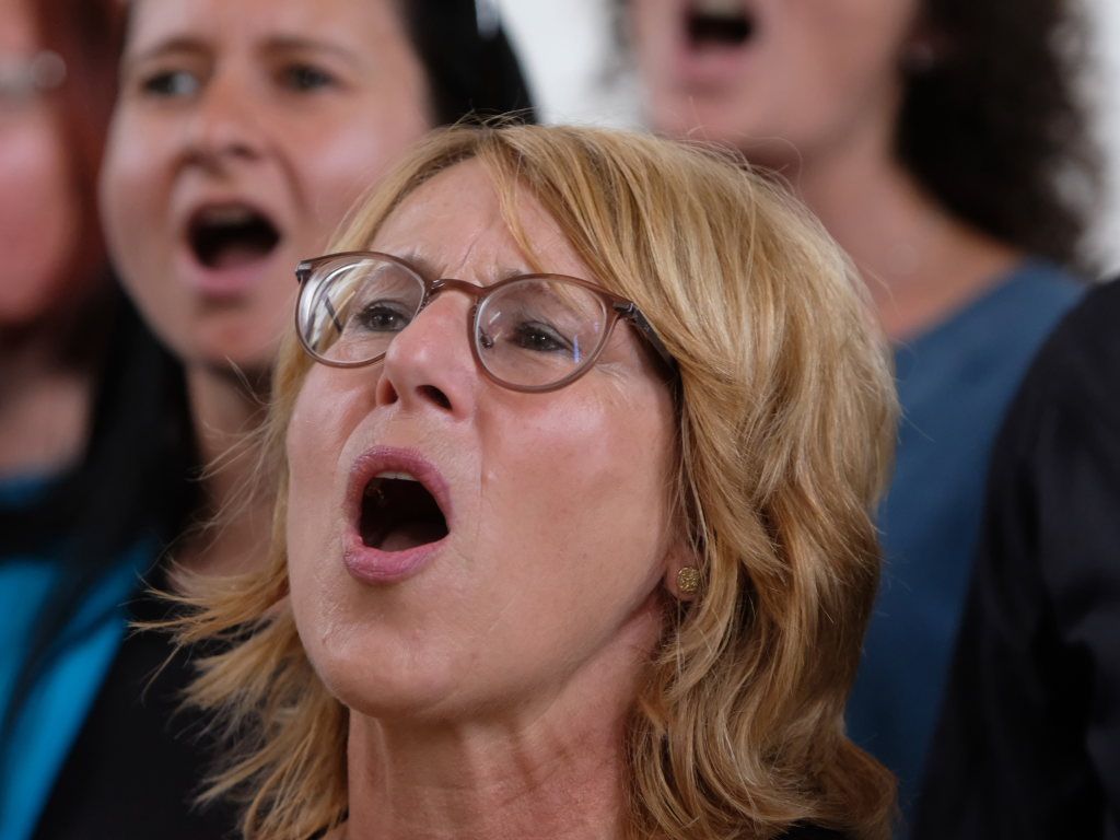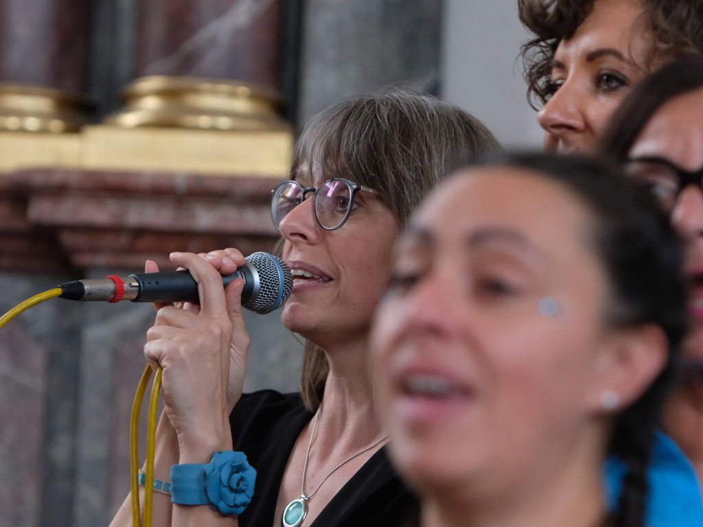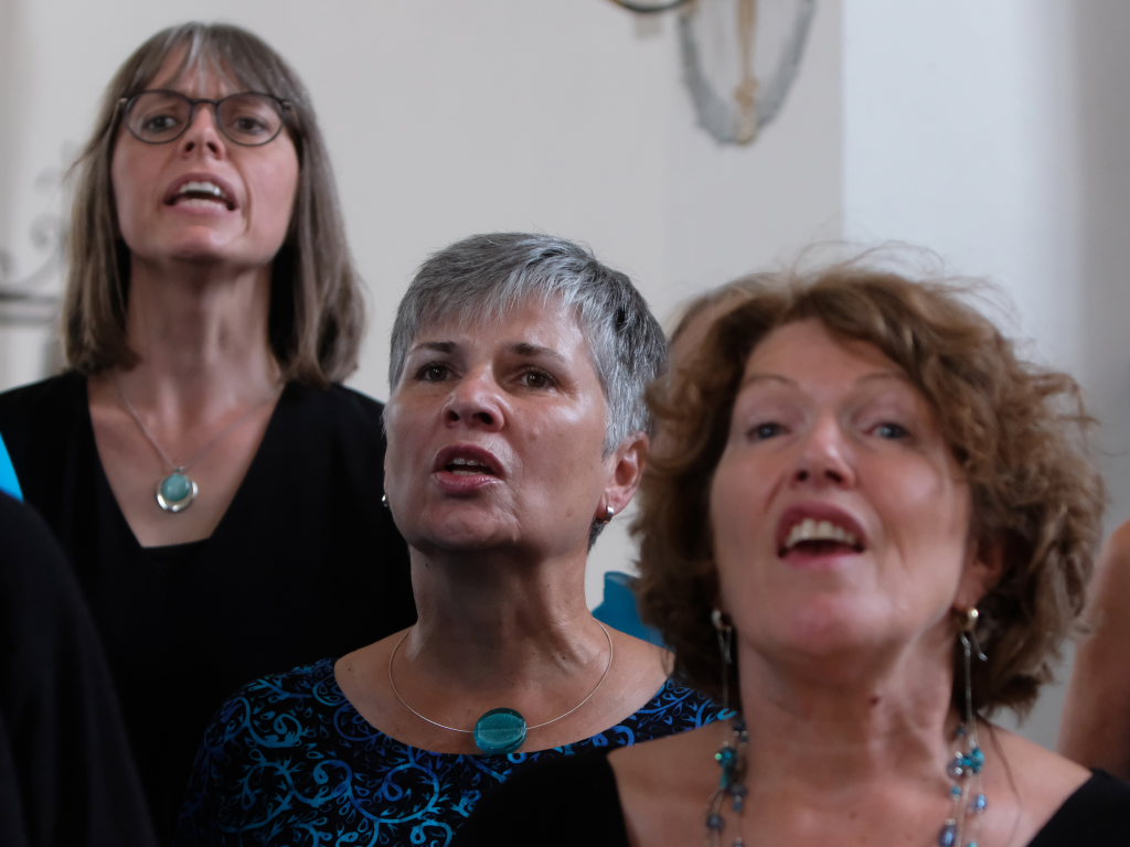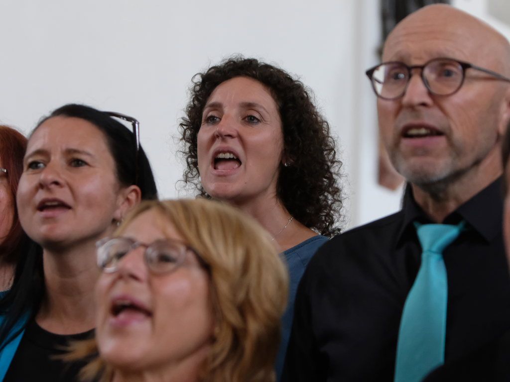 Bevor der Chor „Going up yonder“ wieder mit Birgit Werner als Solistin sang, stimmte der einführende Text auf das Lied ein: „Ziel eines jeden Lebens ist der Tod, die Erlösung, der Himmel. Mit Gottes Gnade bestreite ich diesen Weg, bis ich vor seinem Angesicht stehe – auf der anderen Seite.“