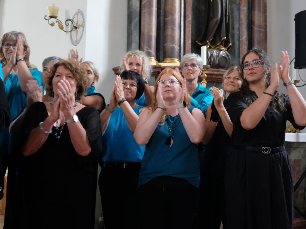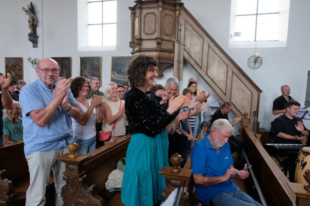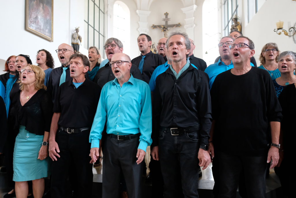 Um wieder ein wenig von diesem Thema wegzukommen, das zwar zum Leben dazugehört, aber nicht ganz dem entsprach, weswegen Chor und Besucher in die Kirche in Aitrach gekommen waren, nämlich um das Leben und Gott zu feiern, lud Peter Litzbarski alle ein, mit den letzten Liedern „Everybody `s talking“ zu leben und eine wahre „Heilig Geist Party“ – „Good to the very last drop“ zu feiern. Mit diesem Lied fachte der Chor zum Abschluss noch viele positive Emotionen an, bekam stehende Ovationen vom Publikum, das sich die Zugabe „This train“ damit redlich verdiente.