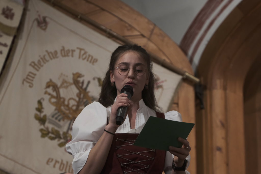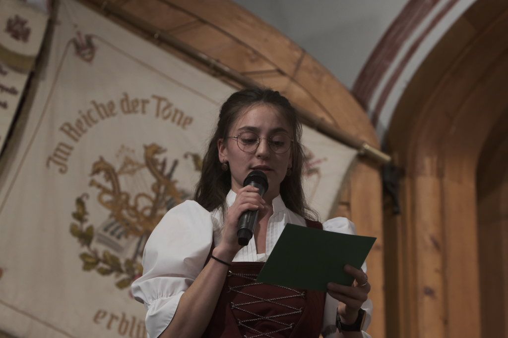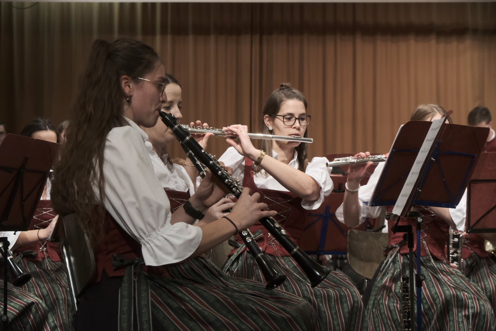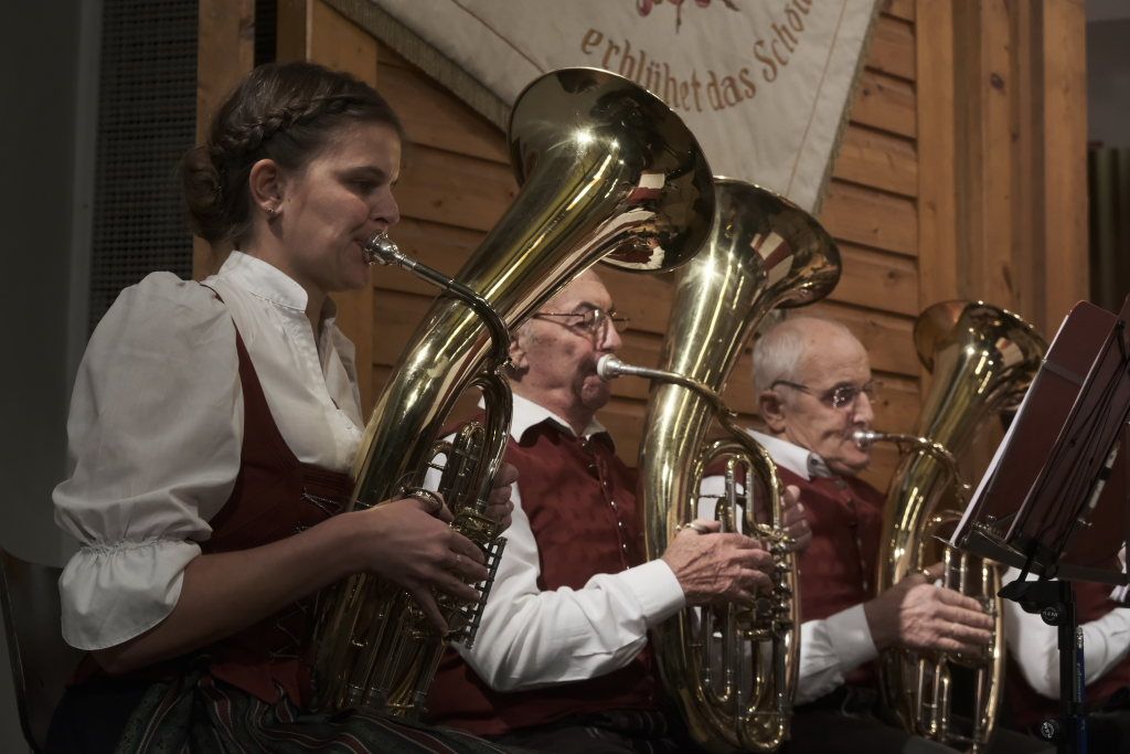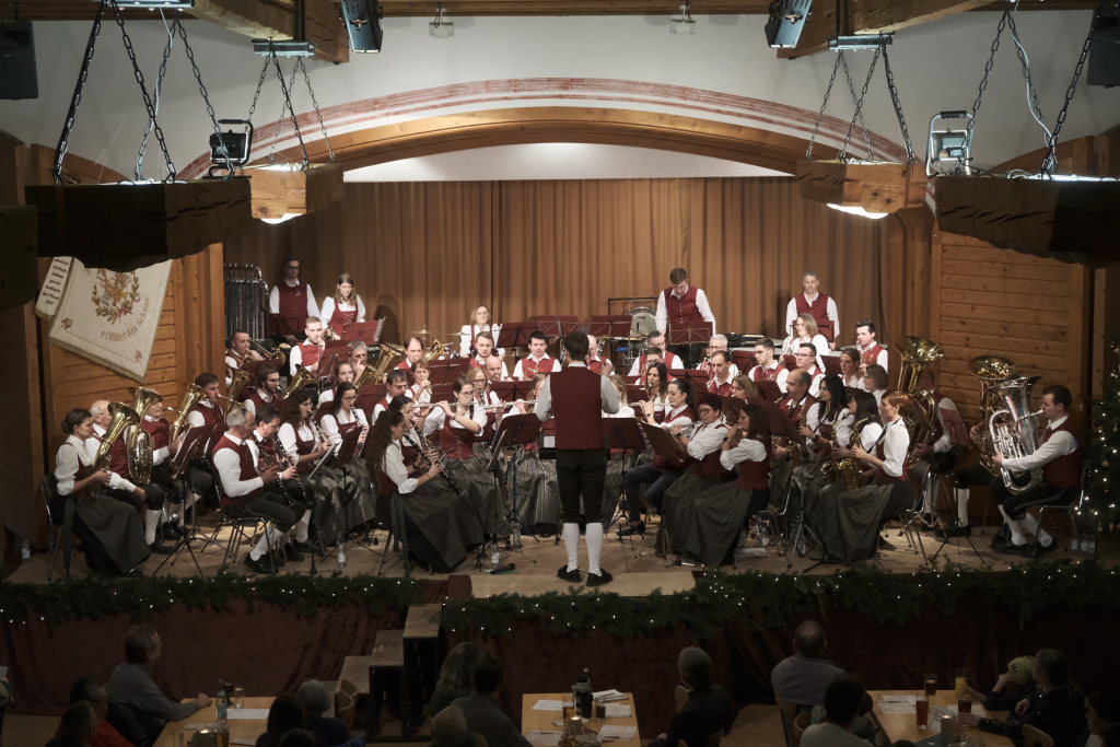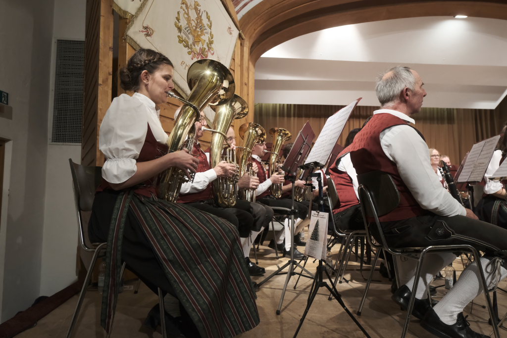 Mit dem schmissig-knackigen Konzertmarsch „Marsch vom edlen Volk“ mit einem sehr melodiösen Trio, geschrieben von Johannes Guggenmos und arrangiert von Alexander Pfluger, dem Gründer der „Schwindligen 15“, kehrten die Musiker nach der wohlverdienten Pause auf die weihnachtlich geschmückte Bühne des Dorfstadels zurück. „Heute muss es wohl heißen: Für das edle Volk gespielt“, merkte die charmante Moderatorin Heike Reichle dazu an, die gemeinsam mit Patrick Ernle durch das Programm führte.