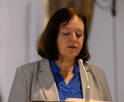 Margit Reischmann beim Verlesen der Namen der 29 seit 1965 verstorbenen Brugger Männer und Frauen; sie nannte auch den Namen des 1947 mit neun Jahren gestorbenen Wirtssohnes. Die Liste ist am Ende dieses Artikels angehängt.