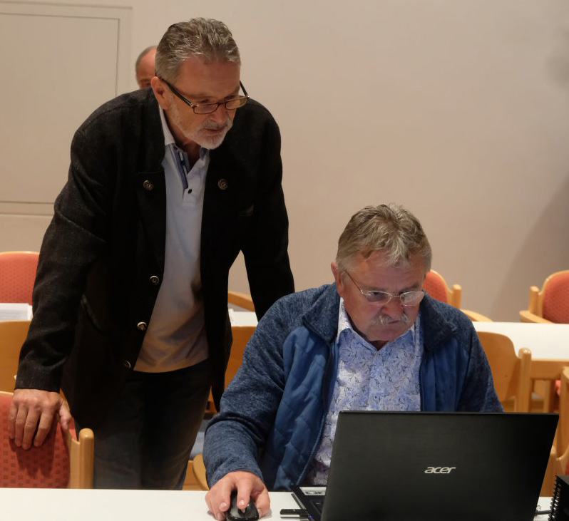 Kurzfristig wurde noch der Text für ein dann gemeinsam gesungenes Lied in den Laptop eingeladen. Hermann Schick, Leiter des Rochus-Quartetts, schaut Alfred Rudhart über die Schulter.