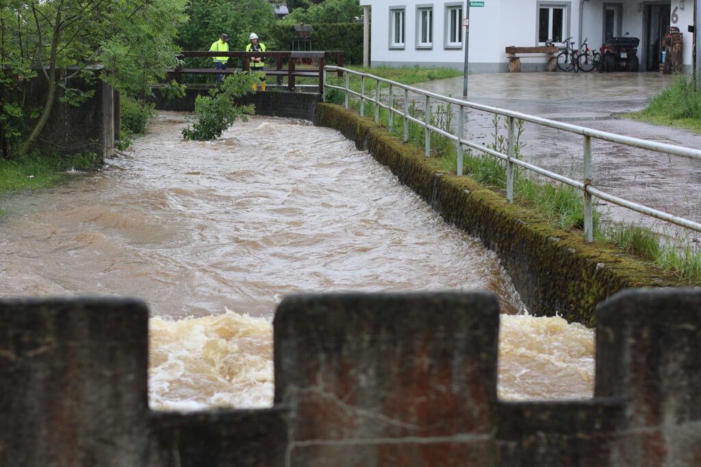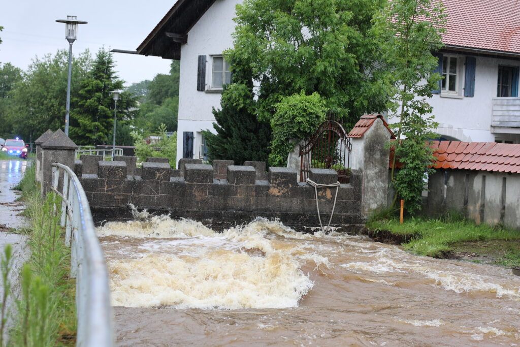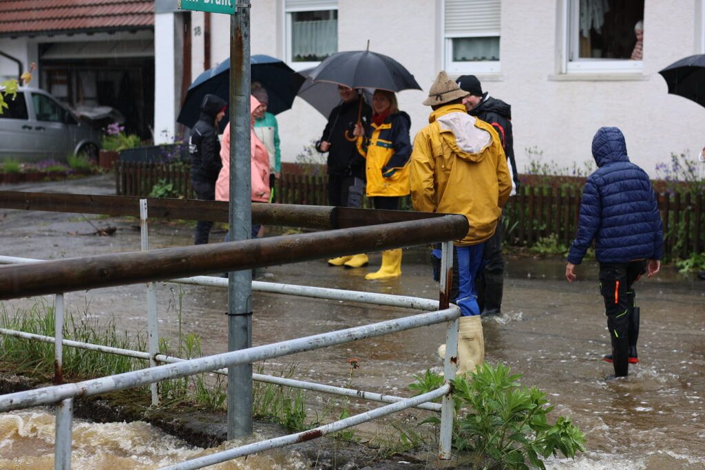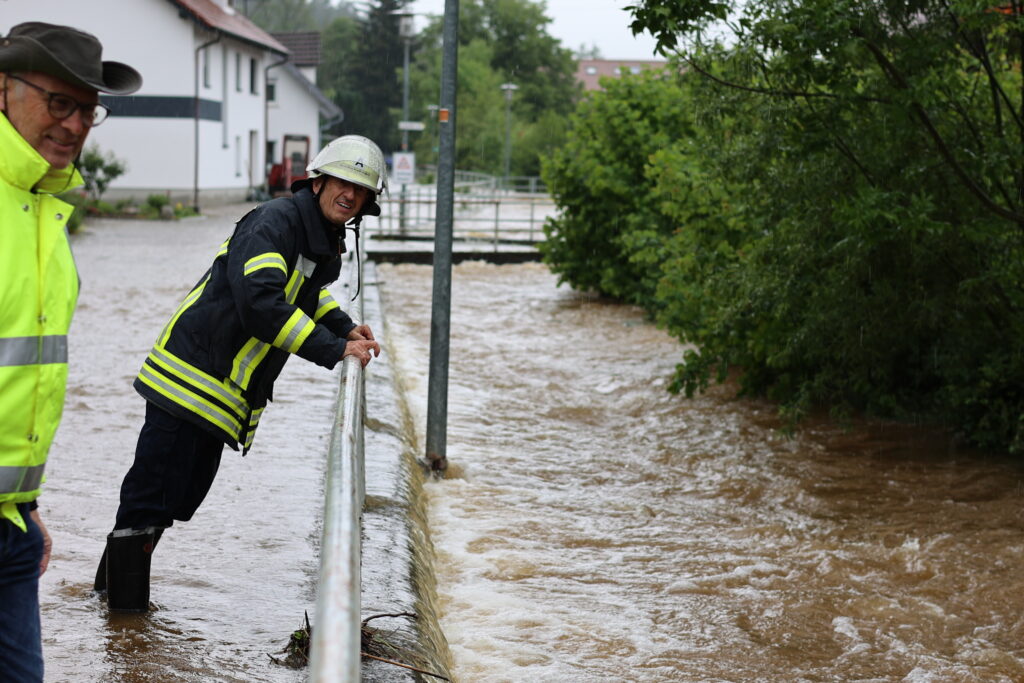 Hauerz – Eine unruhige Nacht für die Anlieger in der Bachstraße und besorgte Mienen bei Ortsvorsteher Kurt Miller und Feuerwehrleuten – das ist das Fazit heute Morgen am 1. Juni. Wie weit wird es noch steigen? Diese Sorge brachte viele Anlieger in der Hauerzer Bachstraße um den Schlaf. Die Bachstraße ist auf weiter Strecke unter Wasser. Ein Pferdestall musste in der Nacht mit Hilfe von Feuerwehrmann Manne Willburger geräumt werden, die Pferde in einen sicheren Stall gebracht werden. Sandsackbarrieren sollen das Schlimmste verhindern. Die Brücken sind Bremsen für das schnell fließende Wasser.