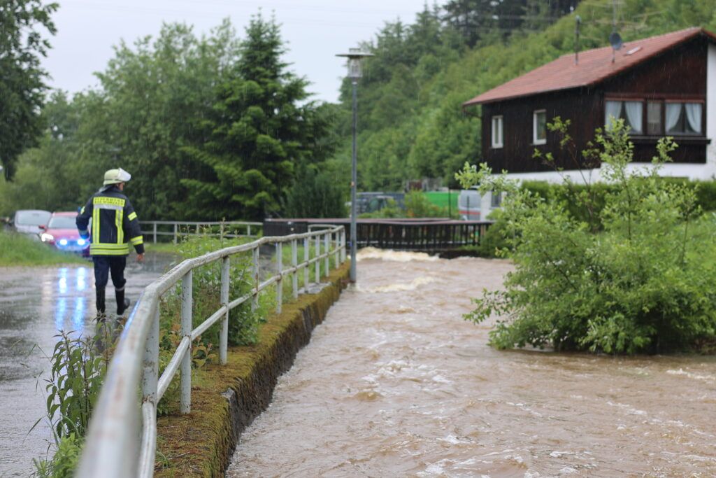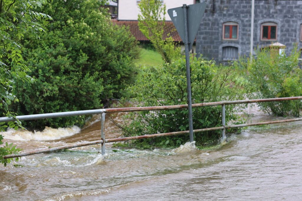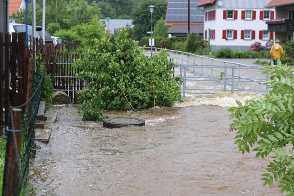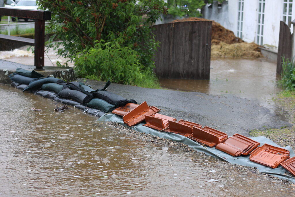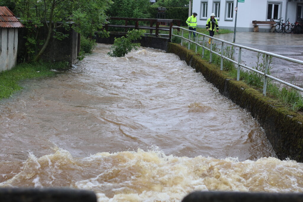 Hauerz – Eine unruhige Nacht für die Anlieger in der Bachstraße und besorgte Mienen bei Ortsvorsteher Kurt Miller und Feuerwehrleuten – das ist das Fazit heute Morgen am 1. Juni. Wie weit wird es noch steigen? Diese Sorge brachte viele Anlieger in der Hauerzer Bachstraße um den Schlaf. Die Bachstraße ist auf weiter Strecke unter Wasser. Ein Pferdestall musste in der Nacht mit Hilfe von Feuerwehrmann Manne Willburger geräumt werden, die Pferde in einen sicheren Stall gebracht werden. Sandsackbarrieren sollen das Schlimmste verhindern. Die Brücken sind Bremsen für das schnell fließende Wasser.