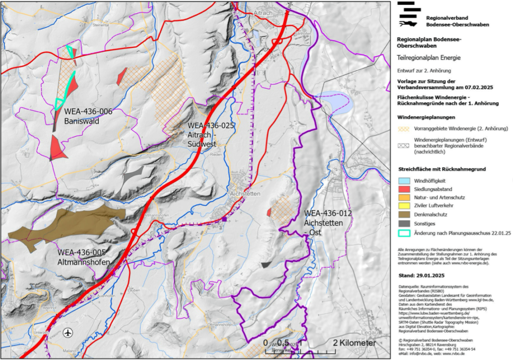 Abbildung aus dem bei der Sitzung des RVBO am 7.2.2025 vorliegenden Kartenmaterial. Kariert dargestellte Bereiche sind Windkraftstandorte: oben links die Windenergieanlage (WEA) „Baniswald“, rechts daneben die WEA „Aitrach Südwest“, östlich von Aichstetten die WEA „Aichstetten Ost“. Bei Altmannshofen ist eine WEA verbal genannt, aber nicht eingezeichnet. Möglicherweise muss diese Planung dem Denkmalsschutz von Schloss Zeil weichen (braun eingefärbte Zone).