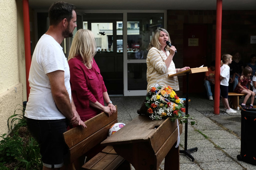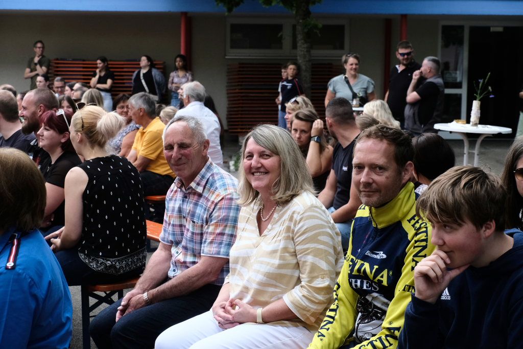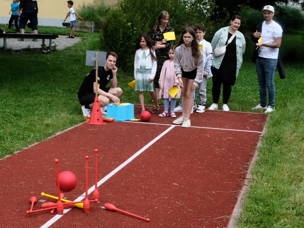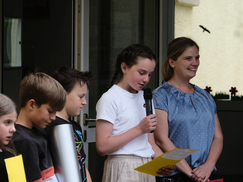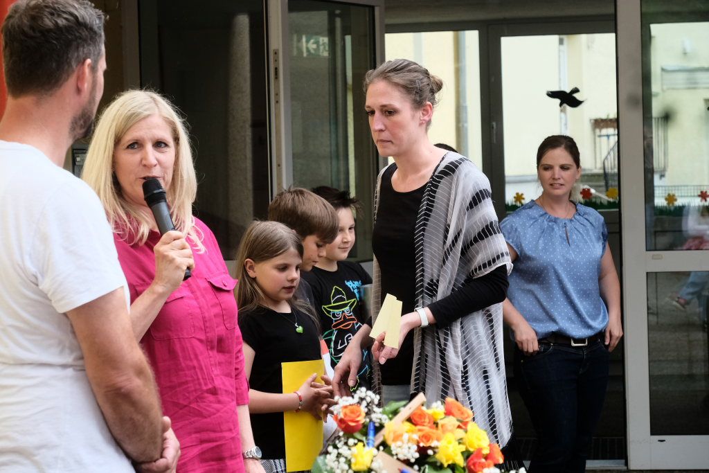 Sie schloss ihre Rede mit einem großen Dank an die Elternvertreter und den Förderverein, die gemeinsam seit mehr als eineinhalb Jahren das Fest vorbereitet hatten, dem Bauhof, der in den letzten Wochen zur Vorbereitung des Festes unglaubliches geleistet hatte, Eltern und ehemaligen Schülern sowie Mitglieder der SG Haidgau, die an den Spielestationen halfen.