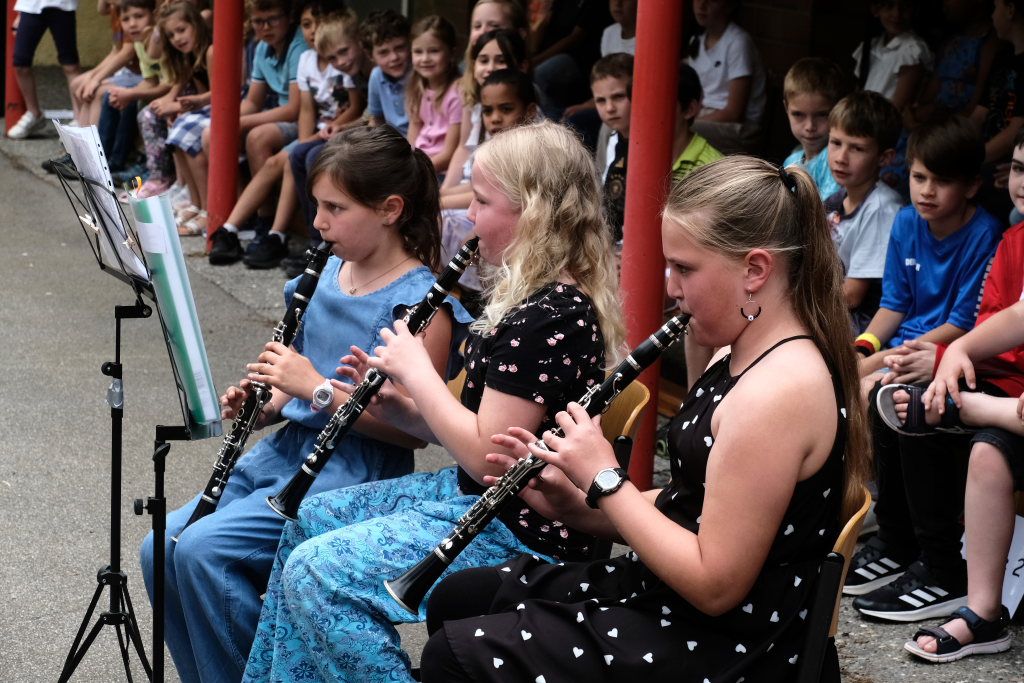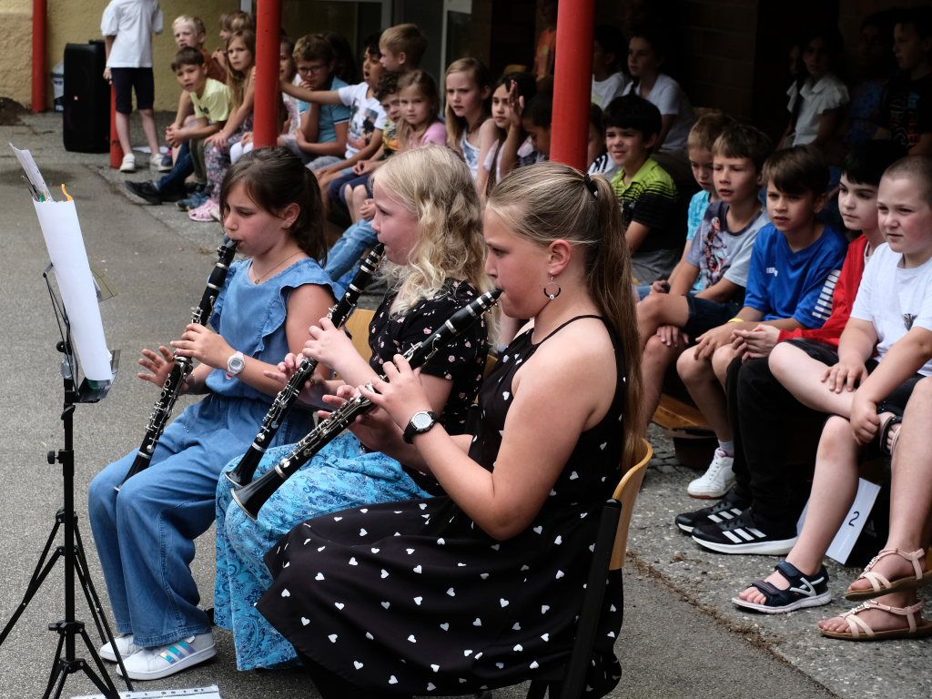 Heike Reichle, die Jugendleiterin des Musikverein Ziegelbach, stellte die Kooperation von Musikverein und Schule vor und warb dafür. Sie hoffte, dass diese Kooperation zum Vorteil für beide noch lange weiterbestehe. Und hatte als Motivationshilfe einen Karton voller Notenständer mitgebracht. Die Bläserklasse der Schule spielte als Ergebnis der zweijährigen Kooperation mit dem Musikverein „Happy Birthday“ in das alle Gäste, Schüler und Lehrer gerne mit einstimmten.