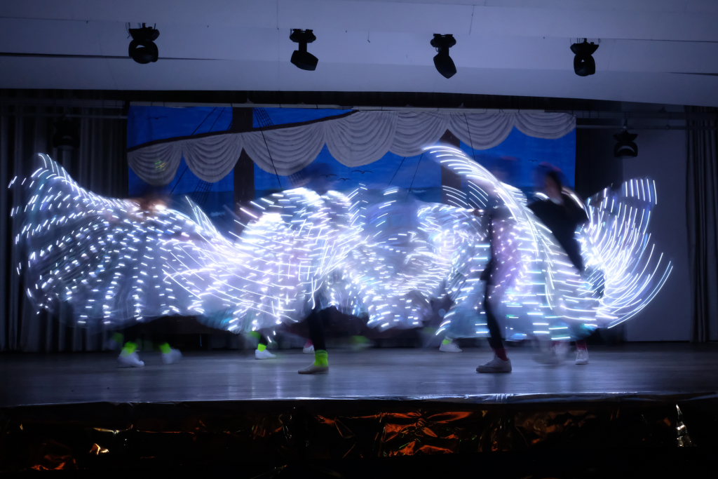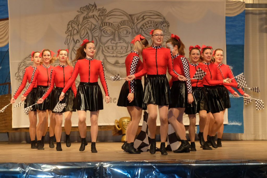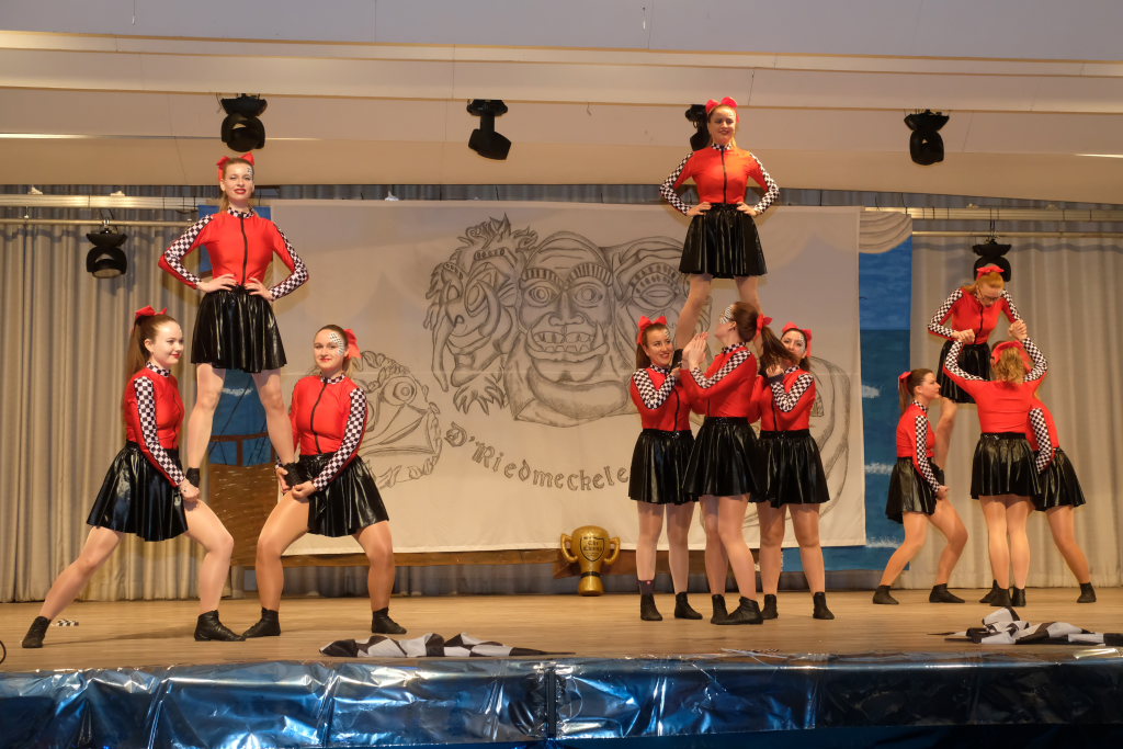 Wie heißt es immer: Das Beste kommt zum Schluss. Und tatsächlich hatten die Programmmacher sich das Beeindruckenste bis zum Schluss aufgehoben: den Mädelstanz. Feengleich und entsprechend flügelschlagend schwebten die Tänzerinnen bei Schwarzlicht über das Bühnenparkett. Dabei leuchteten ihre Flügel im ersten Teil des Tanzes wie die edelstein-besetzten Flügel eines Schmetterlings. Nach deren „Abwurf“ gaben die Zunftmädels richtig Gas und begeisterten die Narren im Saal.