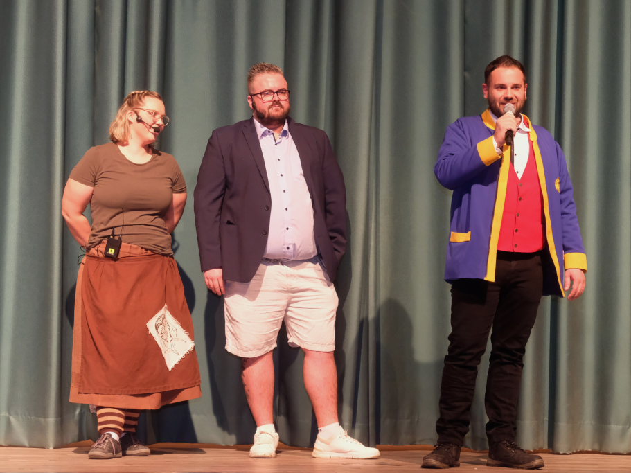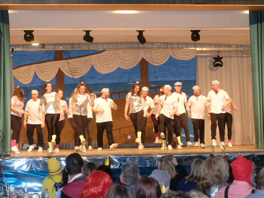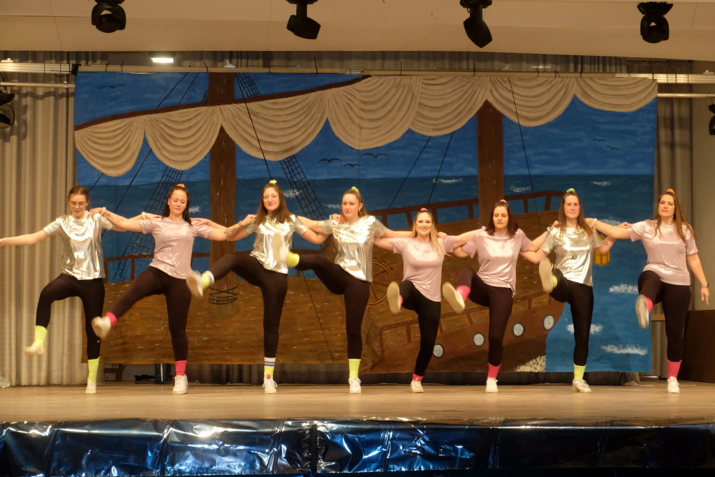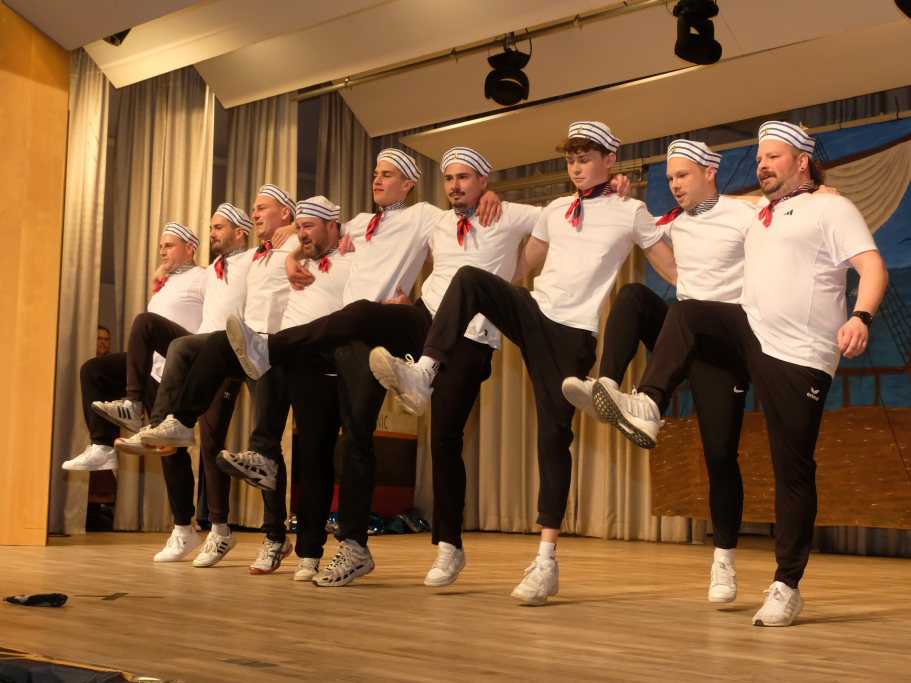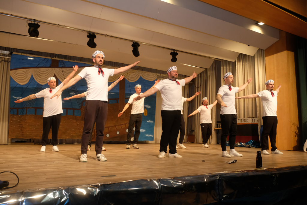 Zwei Damen tummelten sich als Gäste im Spa-Bereich des Vitaliums, während zugleich sich ihre „Ehemänner“ mit weiteren Gleichgesinnten am Stammtisch im Torfstecher austauschten. Beiden gemeinsam war, dass sie sich Gedanken über das Stadtgeschehen machten. Im Programm nicht fehlen durfte natürlich ein Männertanz, der die Herrschaften als Matrosen teilweise bis auf die Titanic mit einer männlichen Kate Winslet führte.