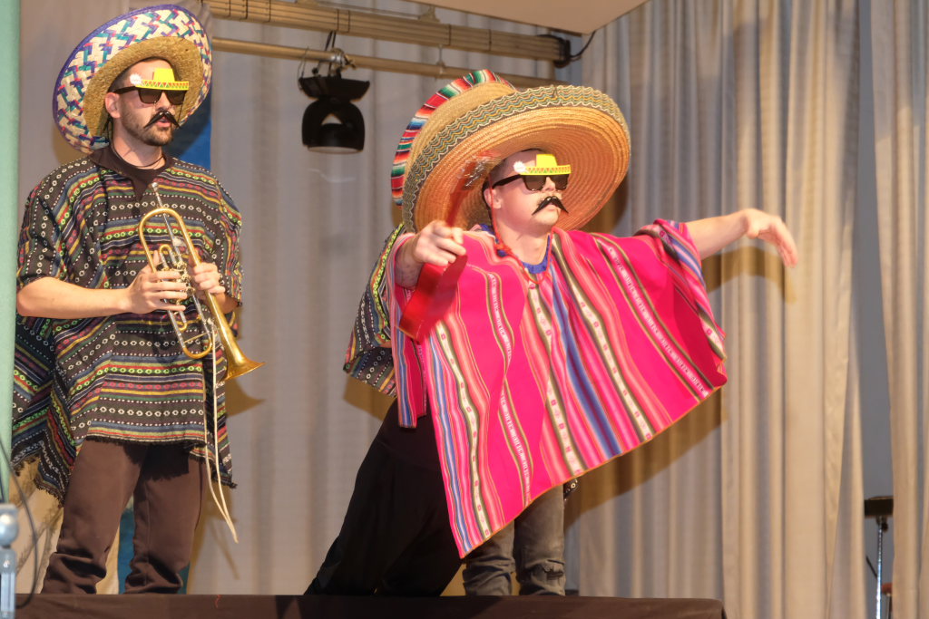 Was passiert, wenn eine Landwirtsgattin in einer Schuhboutique landet? Richtig, da werden High-Heels anprobiert, die den besonderen Belastungen einer in Gummistiefel angetretenen Bauersfrau nicht standzuhalten scheinen. Oder es wurde gefeilscht, wie beim durchlöcherten Designer-Stiefel, weil „do jo eh s´moischte rausgschnitta worra isch.“ Um einiges eleganter – um nicht zu sagen phantastisch elegant – bewegten sich die Mädels des Zunftballetts der Narrenzunft Brochenzell, die zum einen eine hervorragende Kondition hatten und loslegten wie ein Formel 1-Feld. Ein Wunder, dass sie auf dem vor kurzem erneuerten Parkett keine schwarzen Streifen hinterließen. Sehr flexibel bewegten sich wiederum die drei Mexikaner, die mit ihren Instrumenten eine mexikanische Lied-Klassiker wie La Cucaracha zum Besten gaben.