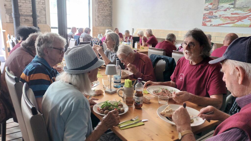 Einige Gäste, die selbst einen Garten haben, erzählten von Kräutern, Blumen und Nutzpflanzen sowie über deren Anbau und Verwendung. Gegen 12.45 Uhr aßen wir in der „Neuen Spinnerei“ Wurstsalat oder Pellkartoffeln mit Kräuterquark, welches allen hervorragend geschmeckt hat. Auch nach der Pause wurde weiterhin fachgesimpelt und die schön angelegten Beete angeschaut. Gestärkt durch zahlreiche Erlebnisse kehrten wir nach zügiger Fahrt am frühen Abend nach Bad Wurzach zurück.