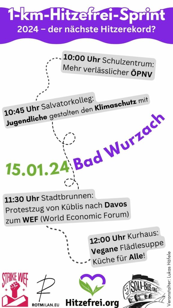 Bad Wurzach (dbsz) – Lukas Häfele aus Ziegelbach, der Initiator der ersten Hitzefrei-Demonstration am 15. Dezember, veranstaltet am heutigen Montag, 15. Januar, erneut eine Kundgebung. Er schreibt: „Wir gehen einen Kilometer gemeinsam und setzen damit ein sichtbares Zeichen für den Klimaschutz.“ Die Demo startet um 10.00 Uhr am Schulzentrum in der Breite. Um 11.30 Uhr sollen Klimaaktivisten, die mit dem Bus von Davos zum Weltwirtschaftsgipfel gekommen waren, hinzustoßen. Nachstehend ein Plakat mit Einzelheiten: