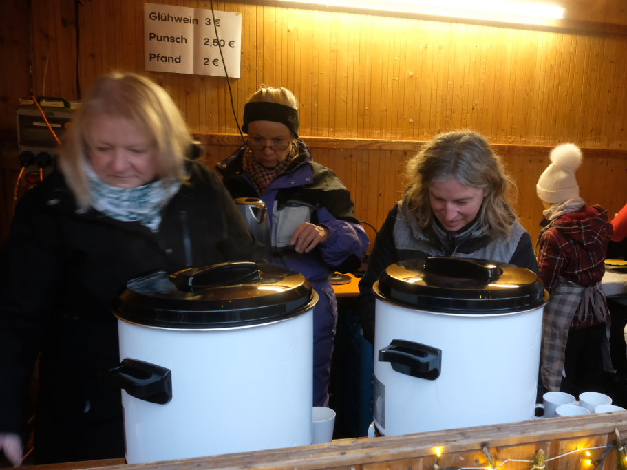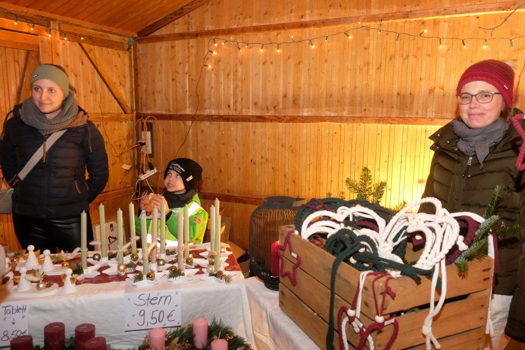 Carola Riss vom Orga-Team des Kirchenchores erklärt bei einer Tasse Punsch , wie es zu dem heimeligen kleinen Markt vor drei Jahren kam. Die Eltern der Kindergartenkinder hatten bei der Metzelsuppe der Blutreitergruppe Dietmanns alljährlich am Totensonntag ihre selbst gebastelten Weihnachts- und Adventsartikel wie Adventskränze und Baumschmuck verkauft. Dann kam Corona. Die Blutreiter mussten danach ihren Termin auf den Januar verlegen und damit war auch für die Kindergarten-Eltern ihr Verkaufstag obsolet.