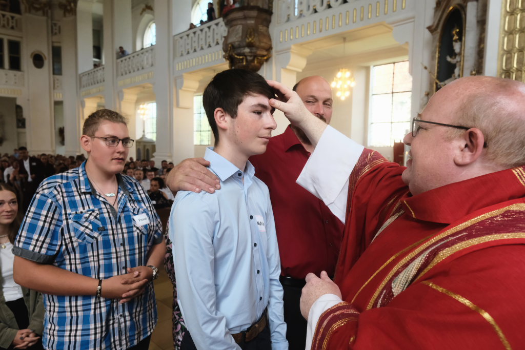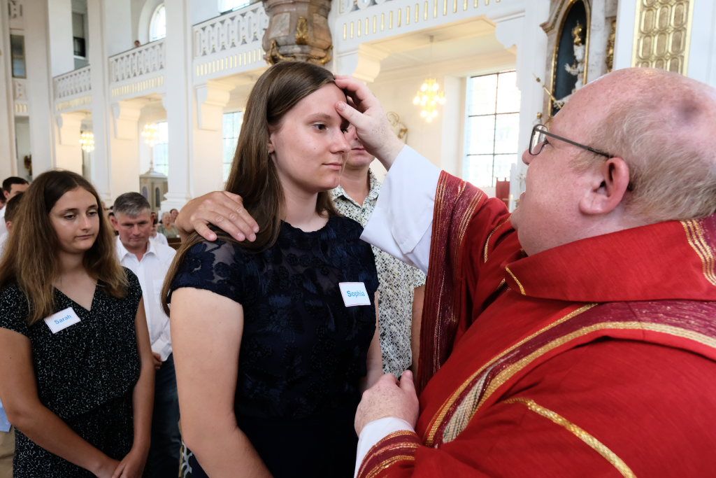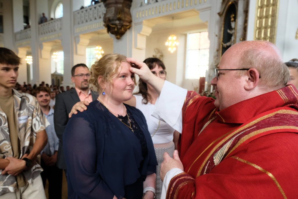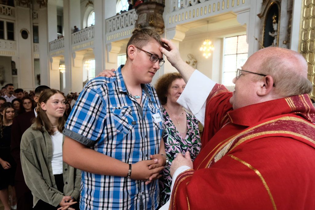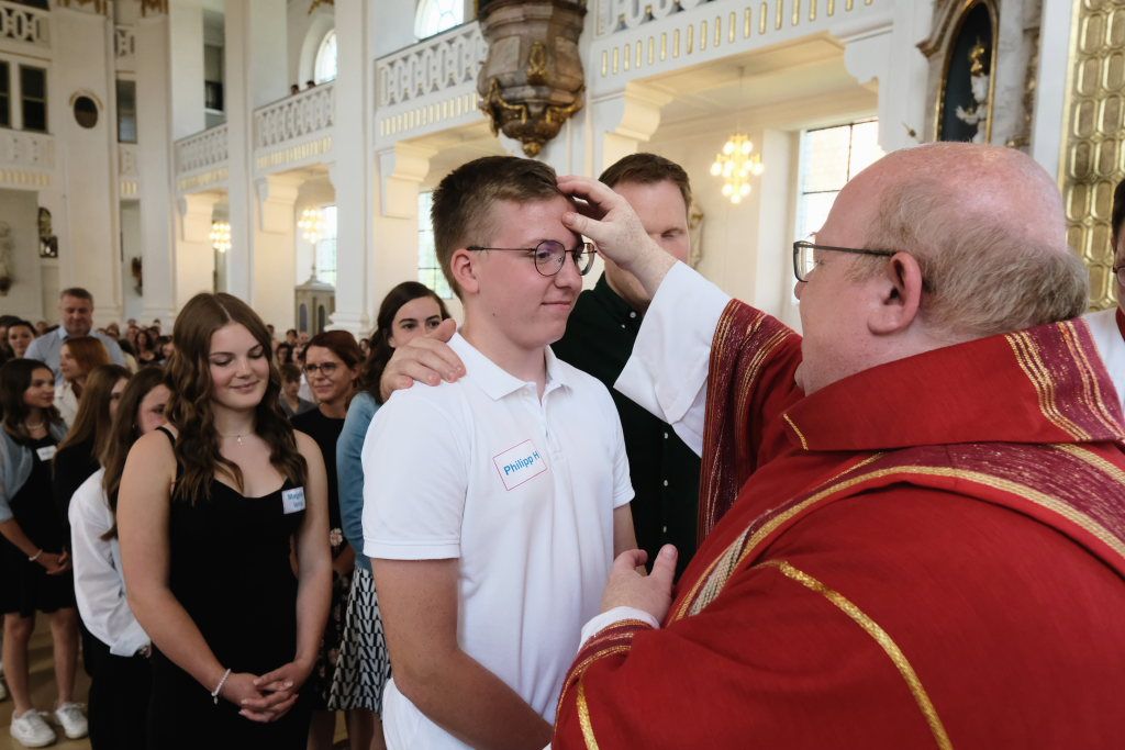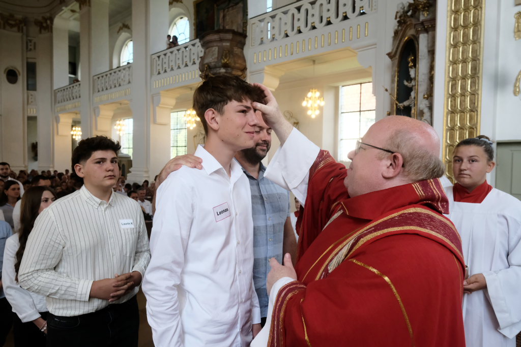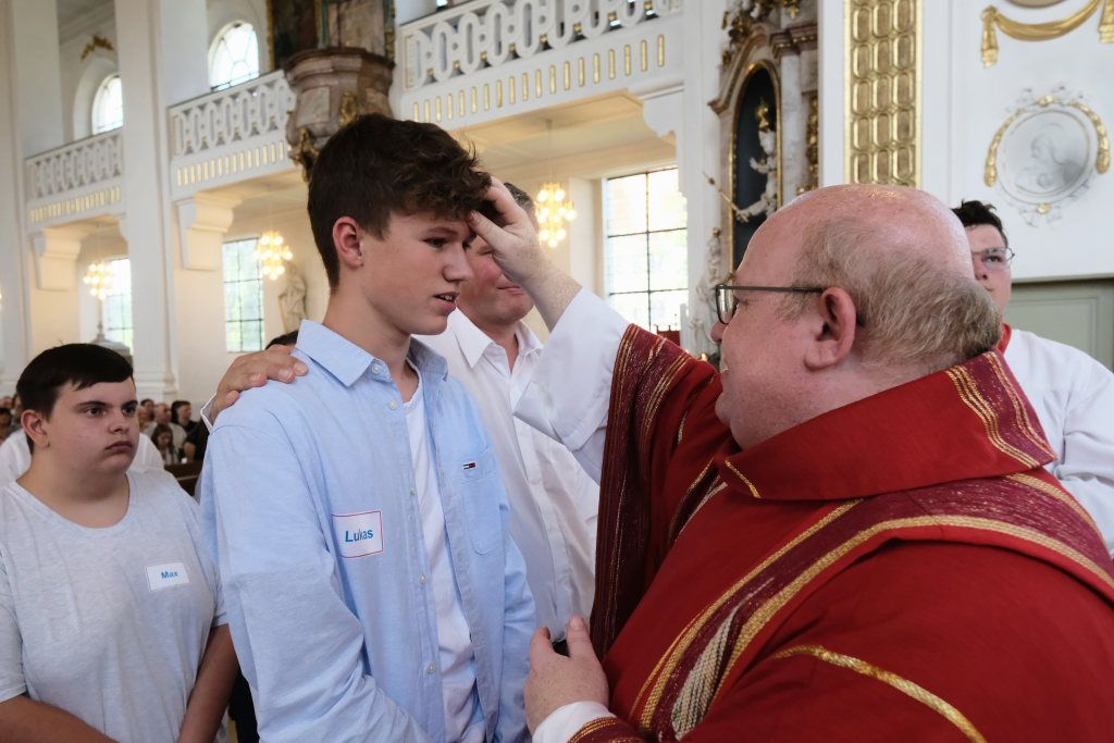 Bad Wurzach – Das Ziel hat der Firmspender erreicht: Jeder der insgesamt 80 Firmbewerber – 47 am Vormittag und 33 am Nachmittag – ging mit einem Lächeln zurück zur Bank, nachdem Weißhaar ihm das Chrisam-Kreuz auf die Stirn gezeichnet hatte und ein wenig mit ihm geplaudert hatte.