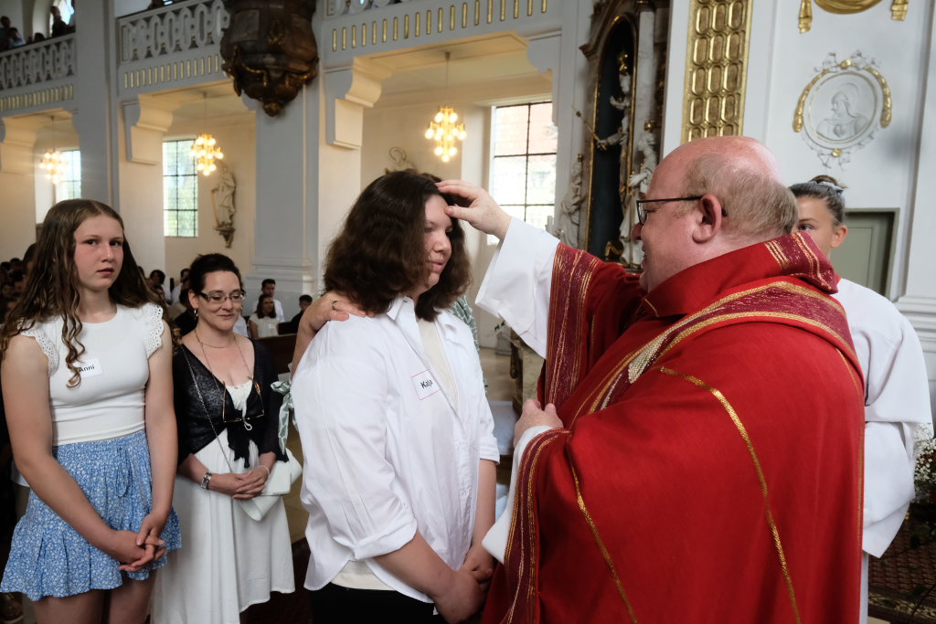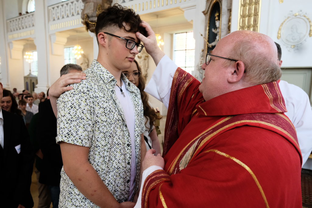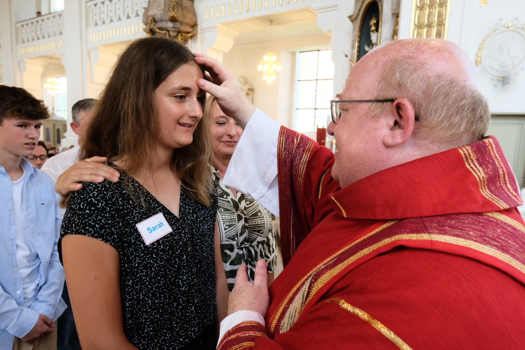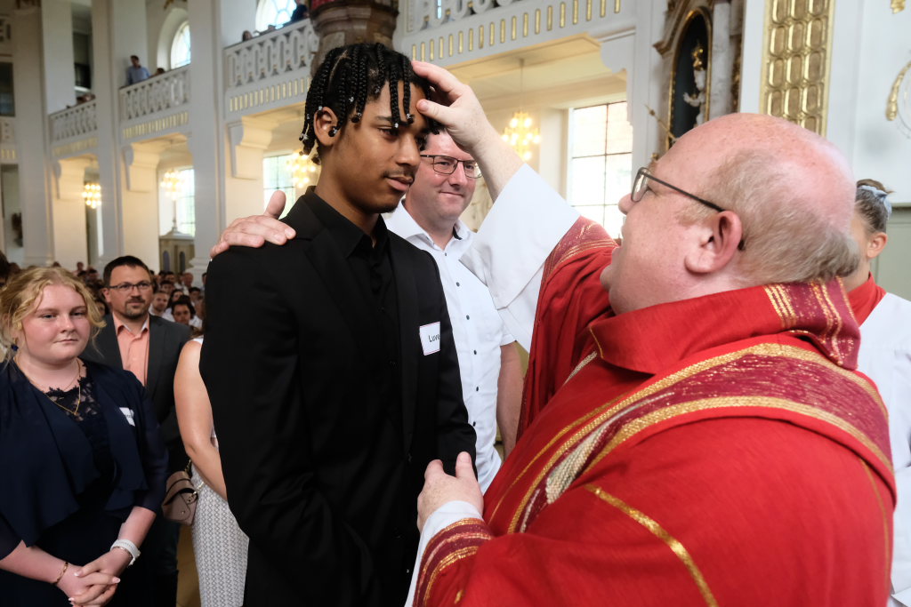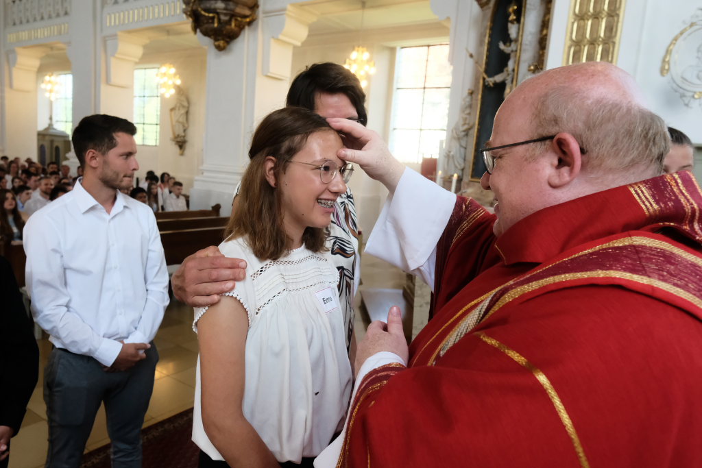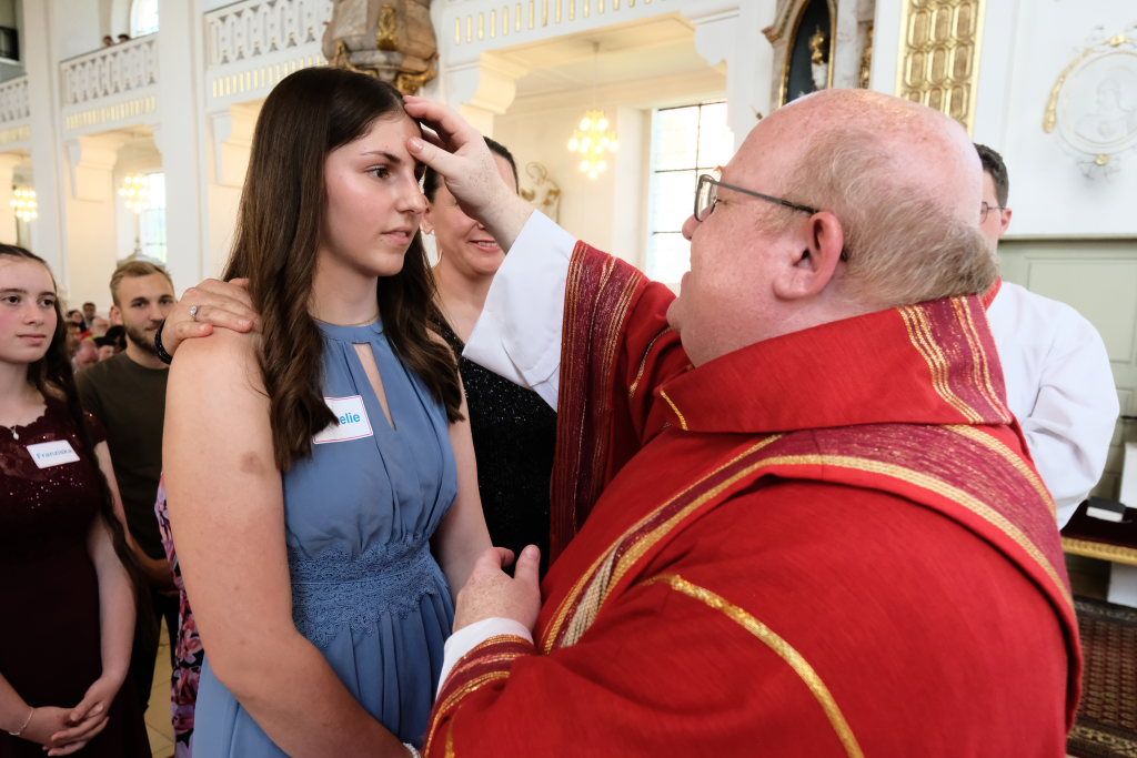 Es hieße jedoch nicht, dass man als Firmbewerber zu allem Ja und Amen sagen müsse. „Wenn ihr jetzt nach vorne kommt, kommt es nicht darauf an, möglichst laut Amen zu sagen, sondern darauf, als der Mensch zu kommen, der ihr wirklich seid.“ Auf seine humorvolle Art richtete er an jeden Firmling einige persönliche Worte, stellte Fragen und kitzelte jedem Bewerber und dessen Paten am Ende des kurzen Gespräches ein Lächeln auf das Gesicht.