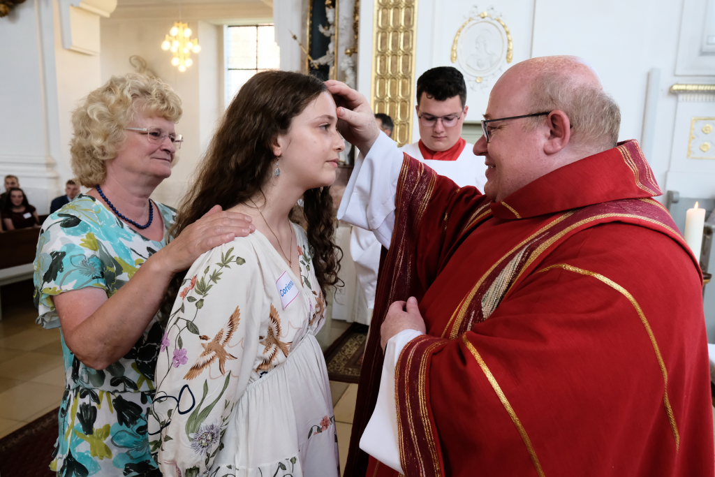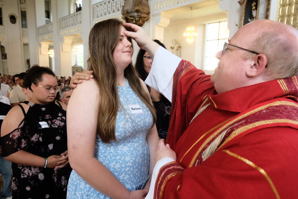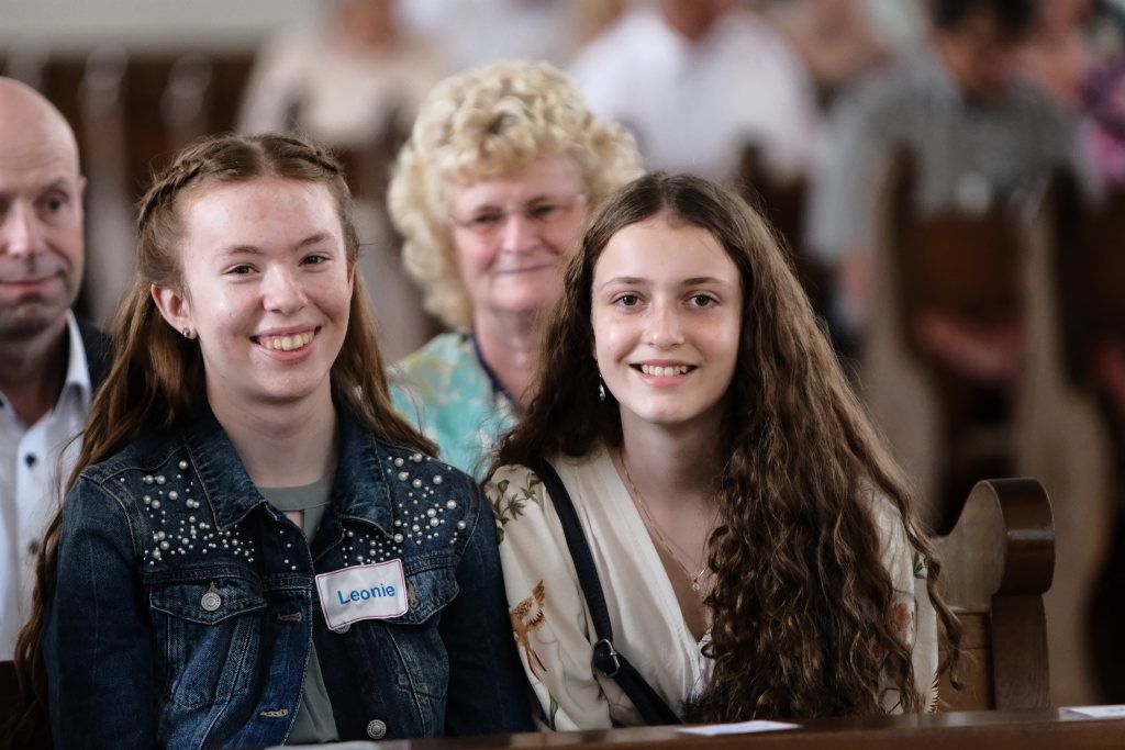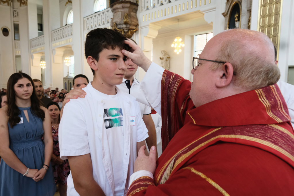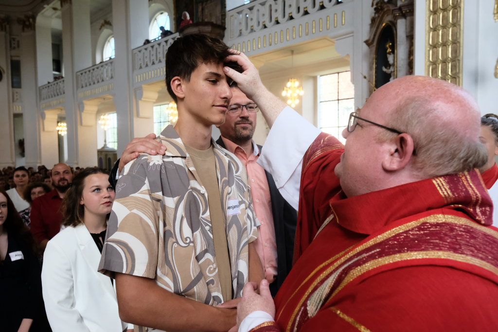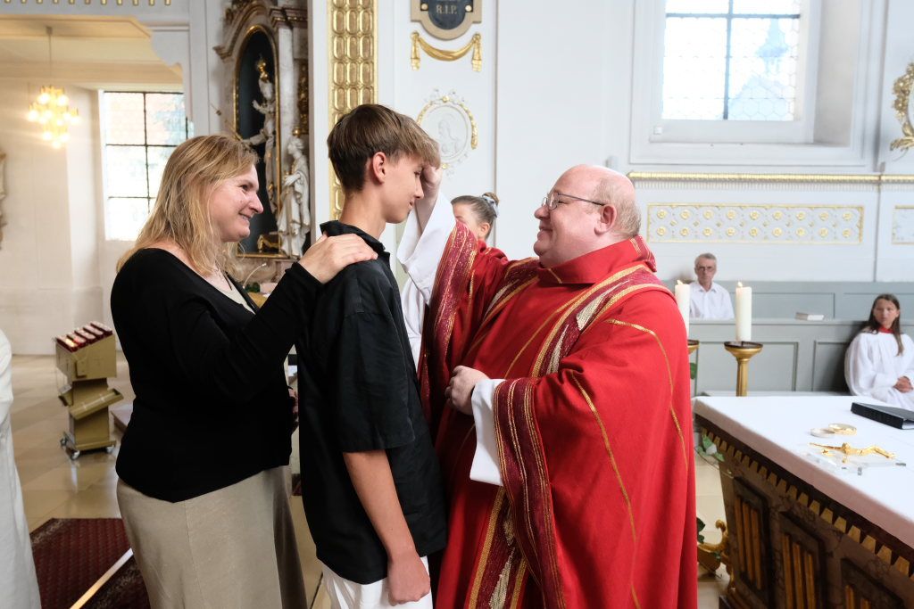 Es hieße jedoch nicht, dass man als Firmbewerber zu allem Ja und Amen sagen müsse. „Wenn ihr jetzt nach vorne kommt, kommt es nicht darauf an, möglichst laut Amen zu sagen, sondern darauf, als der Mensch zu kommen, der ihr wirklich seid.“ Auf seine humorvolle Art richtete er an jeden Firmling einige persönliche Worte, stellte Fragen und kitzelte jedem Bewerber und dessen Paten am Ende des kurzen Gespräches ein Lächeln auf das Gesicht.