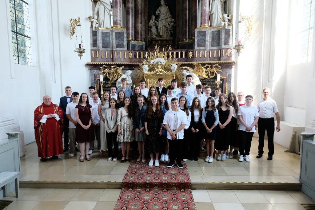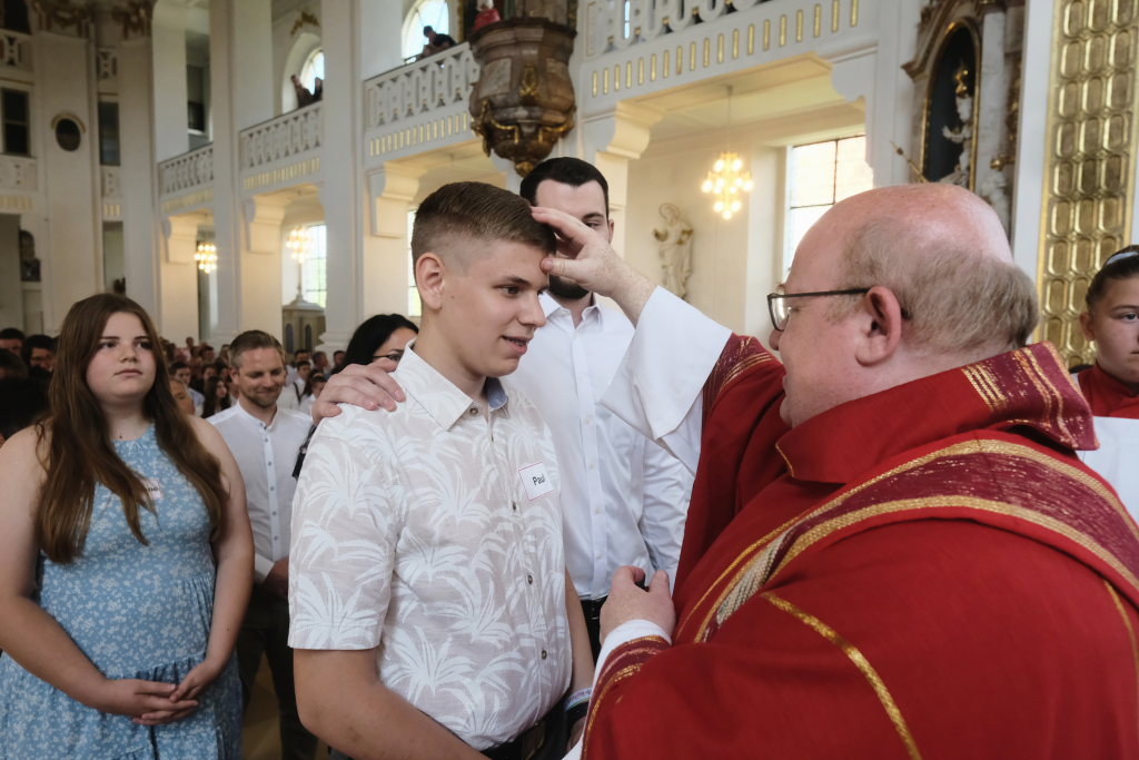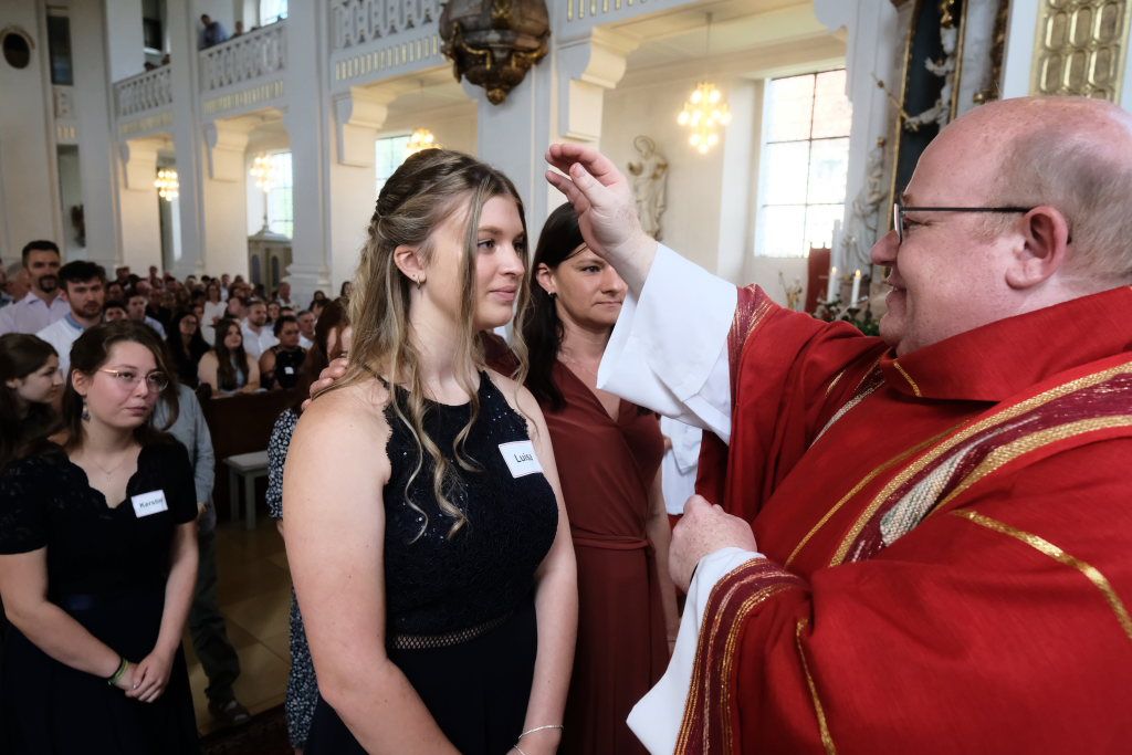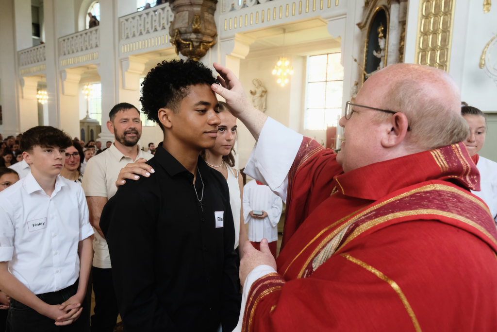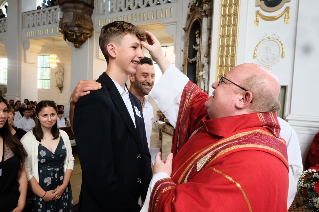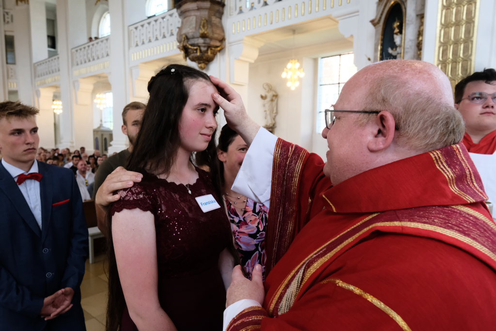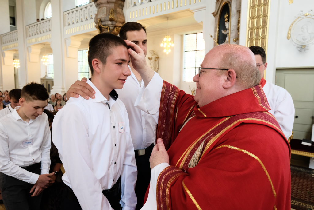 In der monatelangen Vorbereitungszeit mit Pastoralreferent Raimund Miller, der auch für die Organisation der beiden Firmgottesdienste verantwortlich zeichnete, hatten die Firmbewerber viel über die sieben Gaben des Heiligen Geistes gelernt, die den Menschen prägen und bestärken: Weisheit, Stärke, Gottesfurcht, Verstand, Rat, Frömmigkeit und Erkenntnis. Die scherzhafte Frage Weißhaars, wer dabei wen „in den Wahnsinn getrieben“ hatte, brachte ihm einige Lacher aus der vollbesetzten Kirche ein, konnte aber nicht abschließend geklärt werden. In seiner kleinen Ansprache plauderte Thomas Weißhaar ein wenig aus seiner 13 Jahre dauernden Zeit, in der er als Domkapitular das Sakrament der Firmung spenden durfte.
