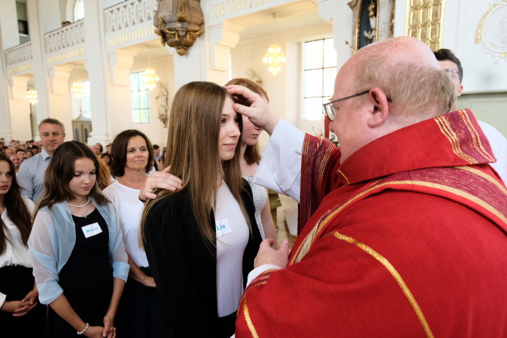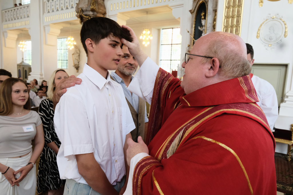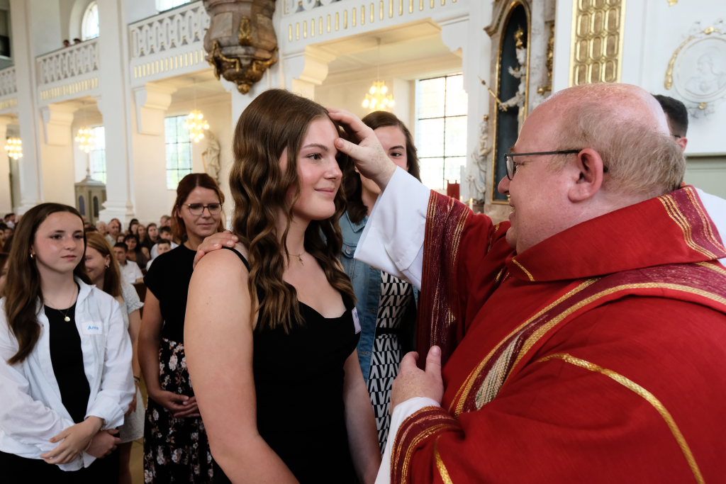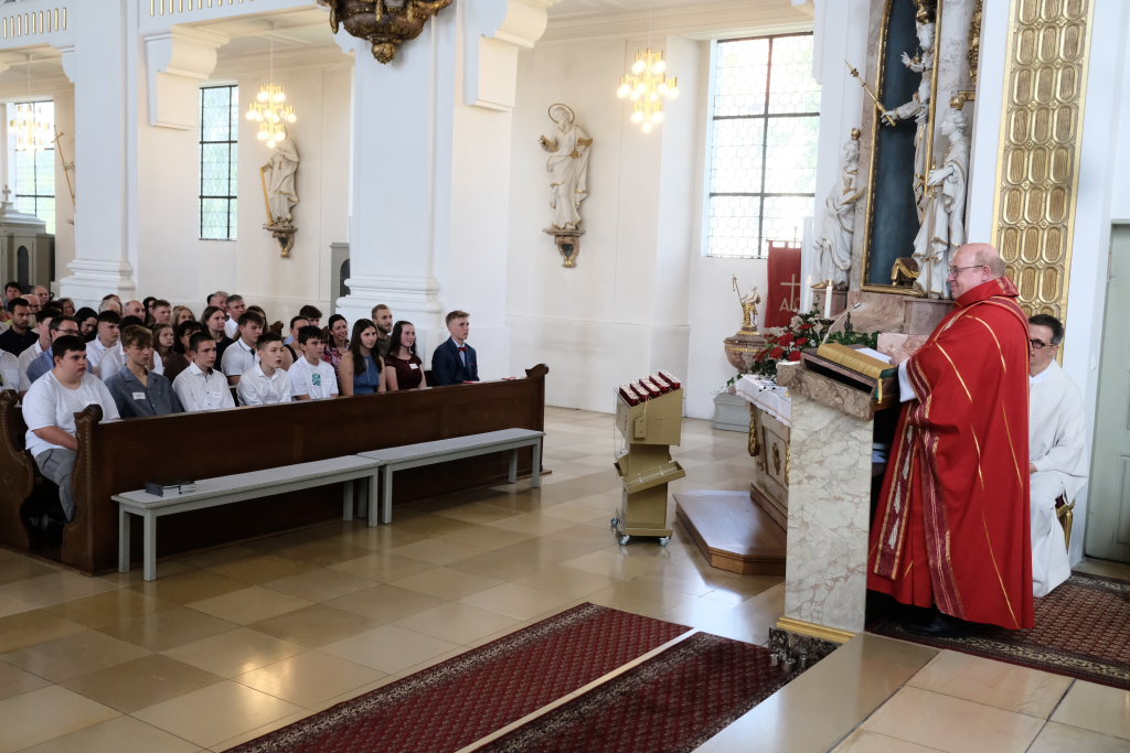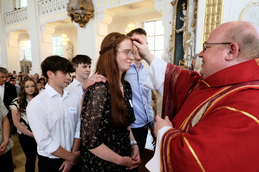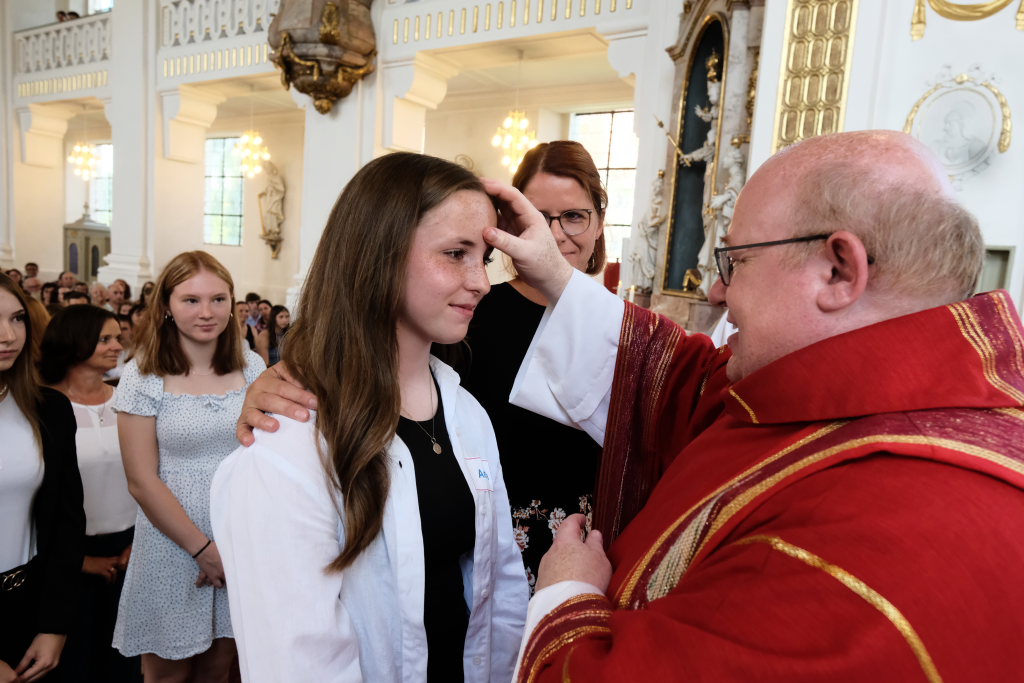 In der monatelangen Vorbereitungszeit mit Pastoralreferent Raimund Miller, der auch für die Organisation der beiden Firmgottesdienste verantwortlich zeichnete, hatten die Firmbewerber viel über die sieben Gaben des Heiligen Geistes gelernt, die den Menschen prägen und bestärken: Weisheit, Stärke, Gottesfurcht, Verstand, Rat, Frömmigkeit und Erkenntnis. Die scherzhafte Frage Weißhaars, wer dabei wen „in den Wahnsinn getrieben“ hatte, brachte ihm einige Lacher aus der vollbesetzten Kirche ein, konnte aber nicht abschließend geklärt werden. In seiner kleinen Ansprache plauderte Thomas Weißhaar ein wenig aus seiner 13 Jahre dauernden Zeit, in der er als Domkapitular das Sakrament der Firmung spenden durfte.