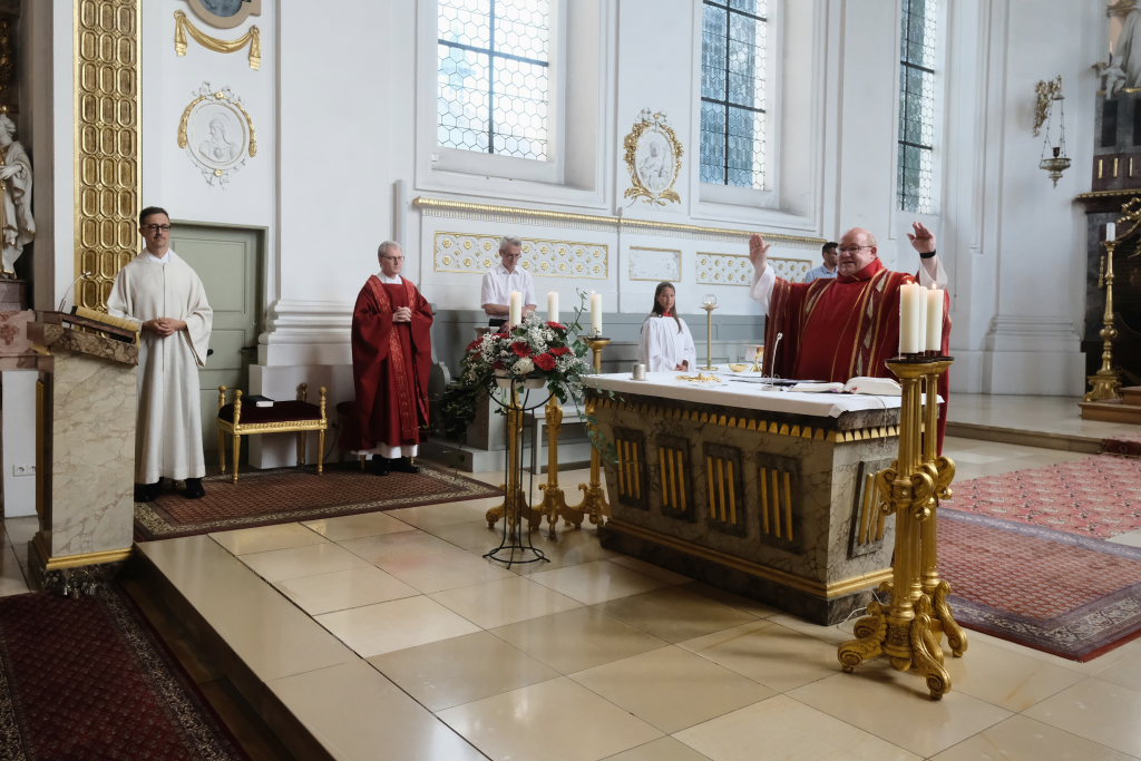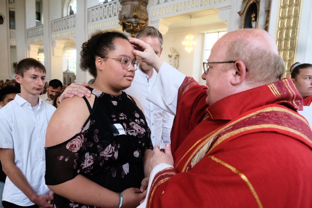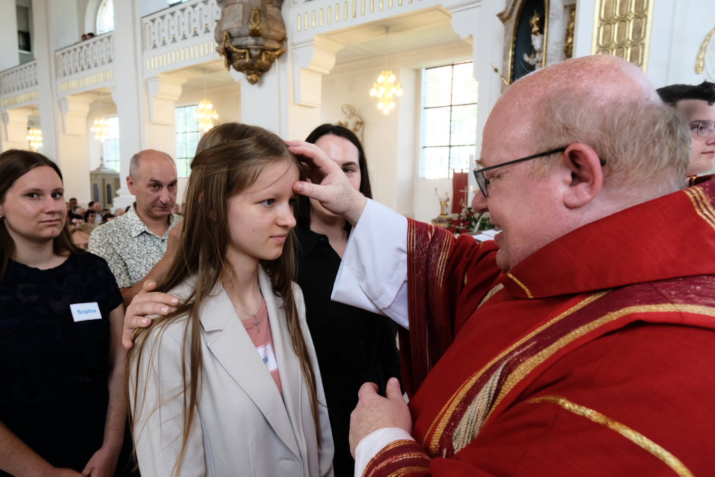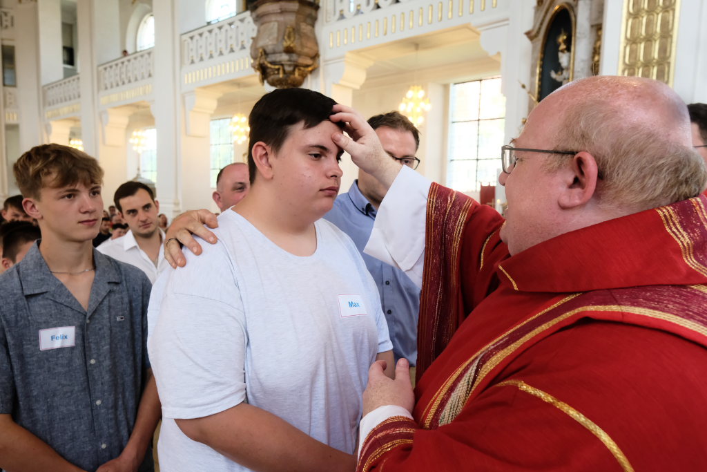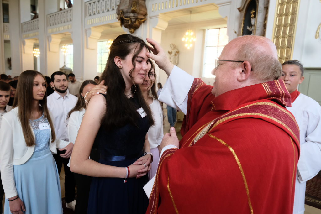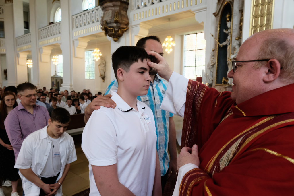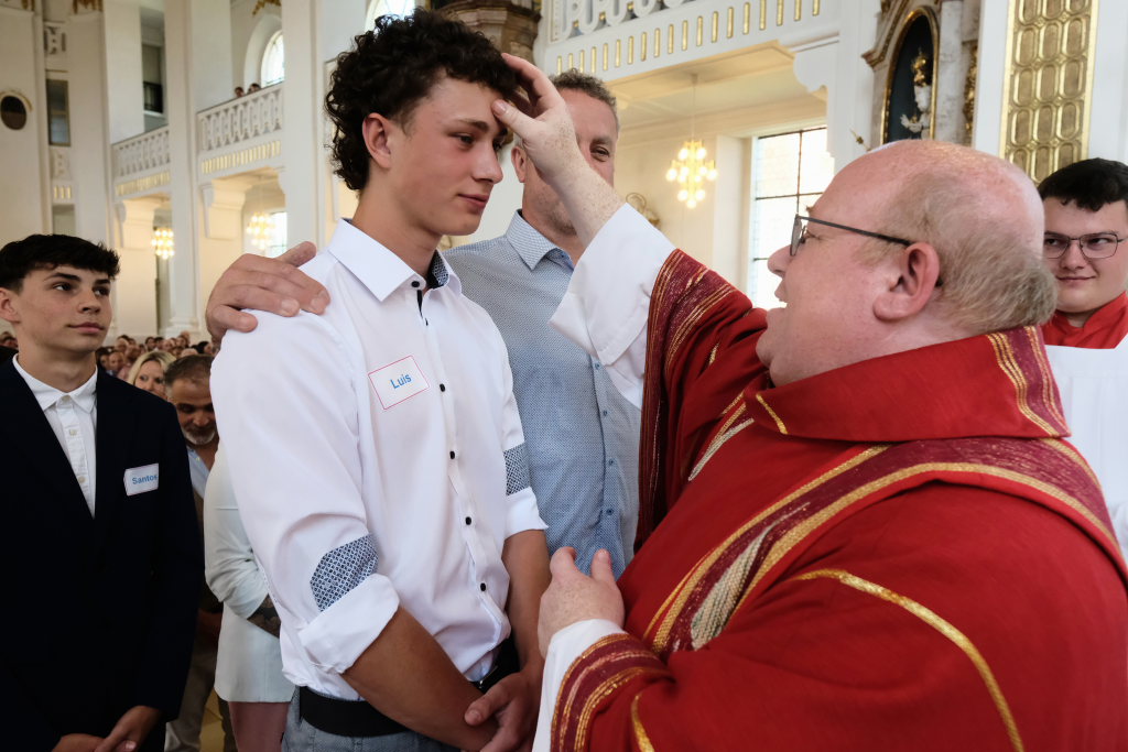 In der monatelangen Vorbereitungszeit mit Pastoralreferent Raimund Miller, der auch für die Organisation der beiden Firmgottesdienste verantwortlich zeichnete, hatten die Firmbewerber viel über die sieben Gaben des Heiligen Geistes gelernt, die den Menschen prägen und bestärken: Weisheit, Stärke, Gottesfurcht, Verstand, Rat, Frömmigkeit und Erkenntnis. Die scherzhafte Frage Weißhaars, wer dabei wen „in den Wahnsinn getrieben“ hatte, brachte ihm einige Lacher aus der vollbesetzten Kirche ein, konnte aber nicht abschließend geklärt werden. In seiner kleinen Ansprache plauderte Thomas Weißhaar ein wenig aus seiner 13 Jahre dauernden Zeit, in der er als Domkapitular das Sakrament der Firmung spenden durfte.