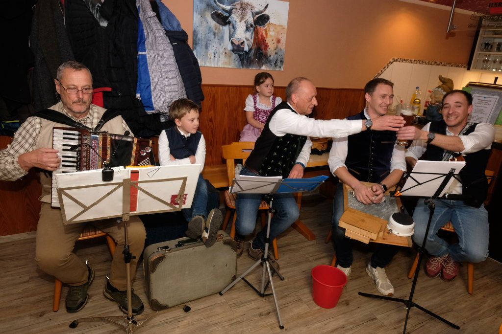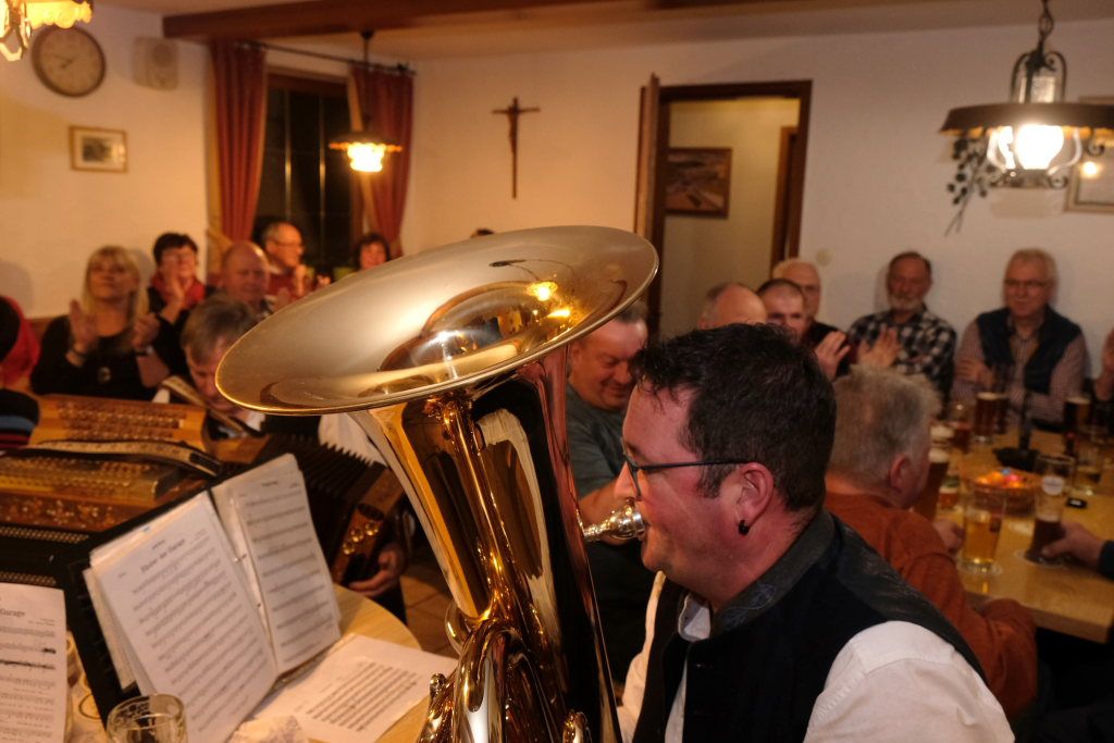Die „Vierer-Musig“ mit Wolfgang Grösser (Tenorhorn), Frank Seitz (Bass-Tuba), Jochen Jöchle (Flügelhorn) und Gregor Holzmann (Steirische Harmonika) begannen ihre musikalische Rundreise im Gasthaus Hirsch. Das Quartett unterhielt die Wirtshausbesucher dort in der sehr gut gefüllten Gaststube rund eine Stunde lang mit Klassikern aus der populären Blasmusik wie etwa „Dem Land Tirol die Treue“ aber auch böhmisch-mährischen Polkas und bekannten Walzermelodien zum Mitschunkeln, ehe sie zur nächsten Station aufbrachen.