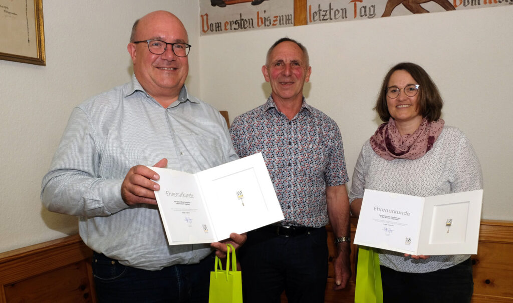 Zur Ehrung standen drei Mitglieder des aktuellen Ortschaftsrates an. Für 20 Jahre im Ortschaftsrat Ziegelbach wurden Daniela Gut und Helmut Mönig mit der Ehrennadel des baden-württembergischen Gemeindetag ausgezeichnet. Sabine Debatin-Schwarz wurde in Abwesenheit mit der Ehrennadel für ihr zehnjähriges Engagement als Ortschaftsrätin geehrt. Jede(r) Geehrte bekam dazu auch noch einen guten Tropfen als Präsent der Stadt.