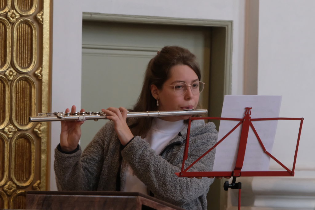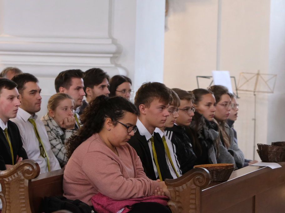 Mit einem solchen setzten die jungen Musiker auch ihr Konzert fort: Auf den „Choral St. Antoni“ des berühmteren Joseph Haydn ließen die aktuellen Schlossbläser das „Timete Dominum“ des weniger bekannten, fünf Jahre jüngeren Michael Haydn erklingen. Mit „Cibel“ des Barock-Komponisten und -Flötisten Jean Baptiste Loeillet setzten sie ihre Konzertreise fort. Mit ihrem letzten Stück, „Schlossfanfare Nr. 2“ setzten sie ein musikalisches Ausrufezeichen: Es ist eine Komposition von Peter Schad, der viele Jahre am Salvatorkolleg als Lehrer tätig war und die „Schlossbläser“ einstens ins Leben rief.