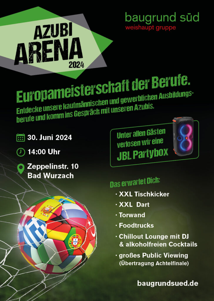 Bad Wurzach – Am 30. Juni ab 14.00 Uhr veranstaltet BauGrund Süd zum ersten Mal die Azubi-Arena – ein Event, das speziell für Jugendliche, die sich für eine Ausbildung interessieren, ins Leben gerufen wurde. Die Azubi-Arena bietet jungen Menschen die Möglichkeit, direkt mit unseren Auszubildenden in Kontakt zu treten und sich umfassend über alle Ausbildungsberufe zu informieren.