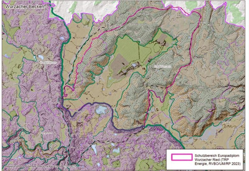 Der Regionalverband hat, wissend um die Europarat-Formulierung „Keine großtechnischen Anlagen auf den Hügeln rund ums Ried!“, eine Karte gemalt (unter Mitwirkung anderer windkraftaffiner Behörden), die eine rote, genauer: pinkfarbene Linie rund um die Hügel zieht. Der Bereich innerhalb der Linie wurde mit dem beschönigenden Titel „Schutzbereich Europadiplom Wurzacher Ried“ versehen und ab ging die Post nach Straßburg zum Europarat.