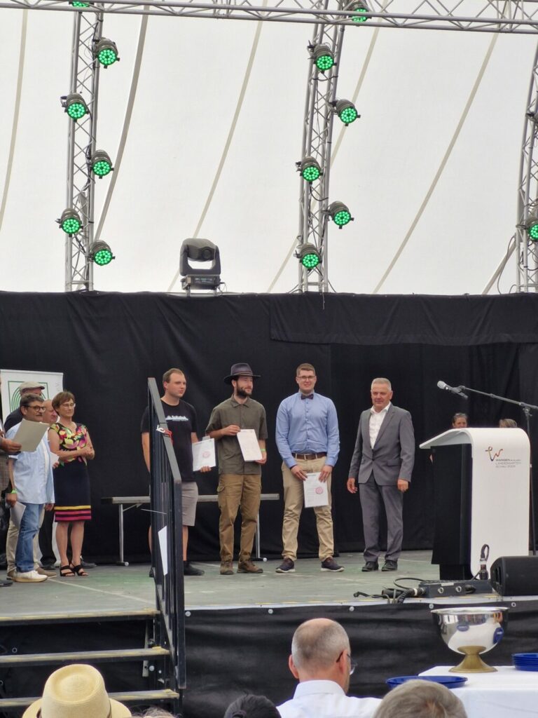 Jonathan Burger (blaues Hemd, mit Fliege) zählt zu den landesweit besten Absolventen der Meisterausbildung für Gärtner, Fachrichtung Blumen- und Zierpflanzenbau. Das Bild zeigt die Ehrung der drei Besten. Links Staatssekretärin Kurtz. Foto: Grad