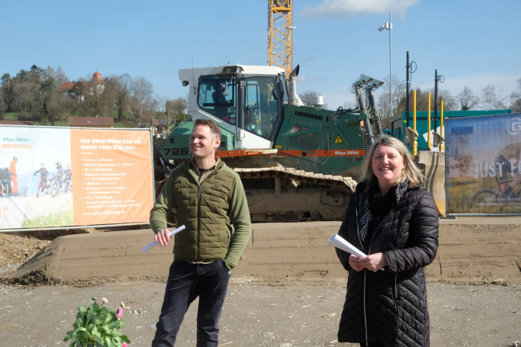 Bürgermeisterin Alexandra Scherer sagte in ihrem Grußwort: „Dieser Spatenstich hatte einen langen Vorlauf.“ Denn als Stefan Geyer mit der Idee auf die Verwaltung zugekommen war, hier zu bauen, war diese Fläche noch landwirtschaftliche Nutzfläche im Außenbereich. Um den Bau zu ermöglichen, musste zunächst der Flächennutzungsplan geändert und ein Bebauungsplan für die Erweiterung des Gewerbegebiet Ziegelwiese erstellt werden. Allein für den Planungsvorlauf gingen zwei Jahre ins Land. Dazu musste aus Hochwasserschutzgründen ein 330 Kubikmeter umfassender Stauraumkanal zur Ableitung des Regenwassers in die Ach gebaut werden. Die dafür erforderliche Tunnelbohrung fiel laut Scherer bereits unter die Kategorie „Spezialbohrungen“. Dafür erhält das gesamte Gewerbegebiet einen Hochwasserschutz, der auf dem auf neuesten Stand ist. „Für die Stadt Bad Wurzach als Wirtschaftsstandort ist es wichtig, den Fachhändlern wie Zweiradsport-Geyer Entwicklungsmöglichkeit zu bieten, um sie am Ort halten zu können.“ Und weil ein Fahrradhändler sehr gut zur Stadtphilosophie mit Natur- und Naturschutz passe, habe man sehr viele Hebel in Bewegung gesetzt.