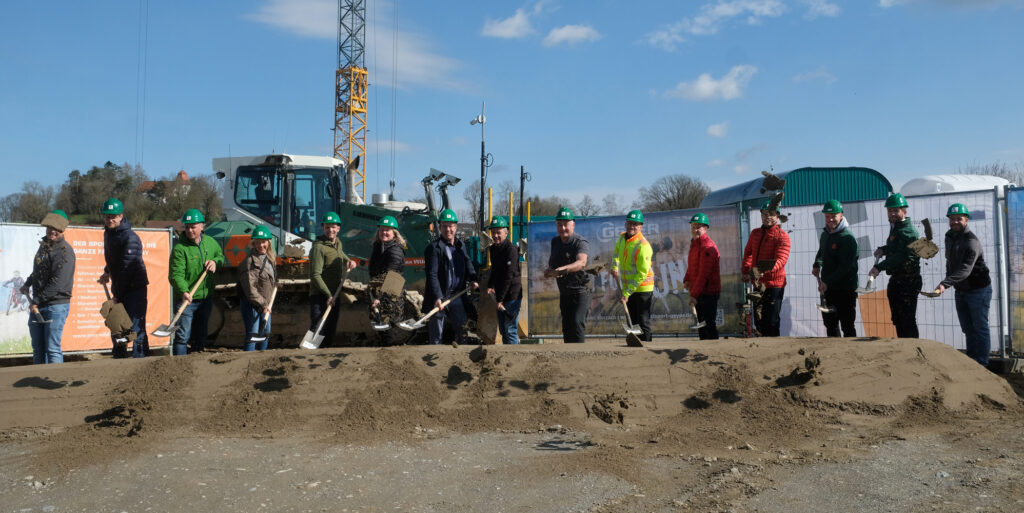Bad Wurzach – Gemeinsam mit Bürgermeisterin Alexandra Scherer, Stadtkämmerer Stefan Kunz und Johannes Thanner (Stadtbauamt) sowie in Anwesenheit des Landtagsabgeordneten Raimund Haser setzte Geschäftsführer Stefan Geyer, seine Frau Stefanie, sein Vater und Firmengründer Josef Geyer sowie Mitarbeiter der Fa. Wild und der Baufirma Fritschle aus Uttenweiler am vergangenen Freitagvormittag (15.3.) den ersten Spatenstich für den Neubau von Zweirad-Geyer auf der Ziegelwiese (Erweiterungszone).