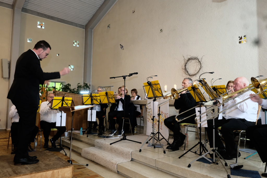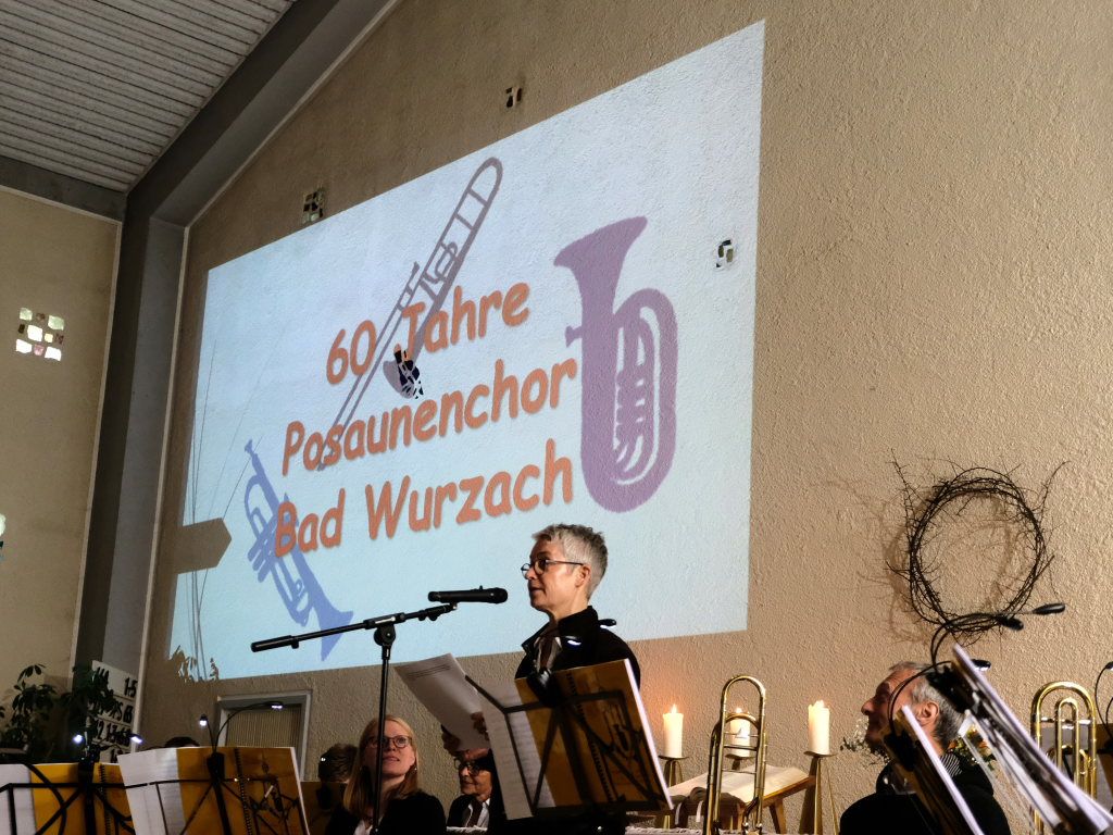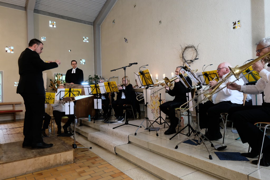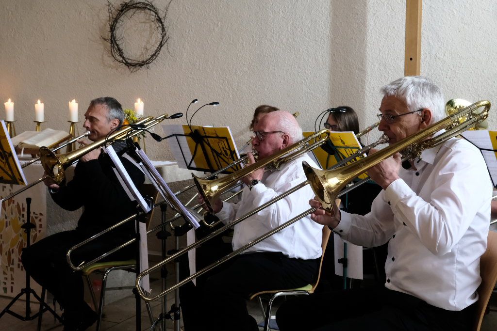 Pfarrerin Silke Kuczera sagte, als sie am Beginn des Gottesdienstes inmitten der Mitglieder des Posaunenchores vor den Altar trat: „Ich komme mir vor wie unter den himmlischen Heerscharen.“ Sie erinnerte in ihrer Begrüßung daran, dass der Chor nur fünf Jahre nach der Einweihung der Kirche vor allem mit Leihinstrumenten aus der alten Heimatgemeinde – Enzvaihingen – von Theo Klein gegründet worden war. Sie freute sich ganz besonders, dass einige Gemeindemitglieder von dort trotz Schneegestöber den weiten Weg nach Bad Wurzach auf sich genommen hatten. „Passender als zum Jubilate-Sonntag hätte dieses Jubiläum gar nicht gefeiert werden können.“