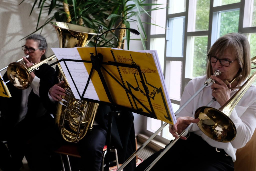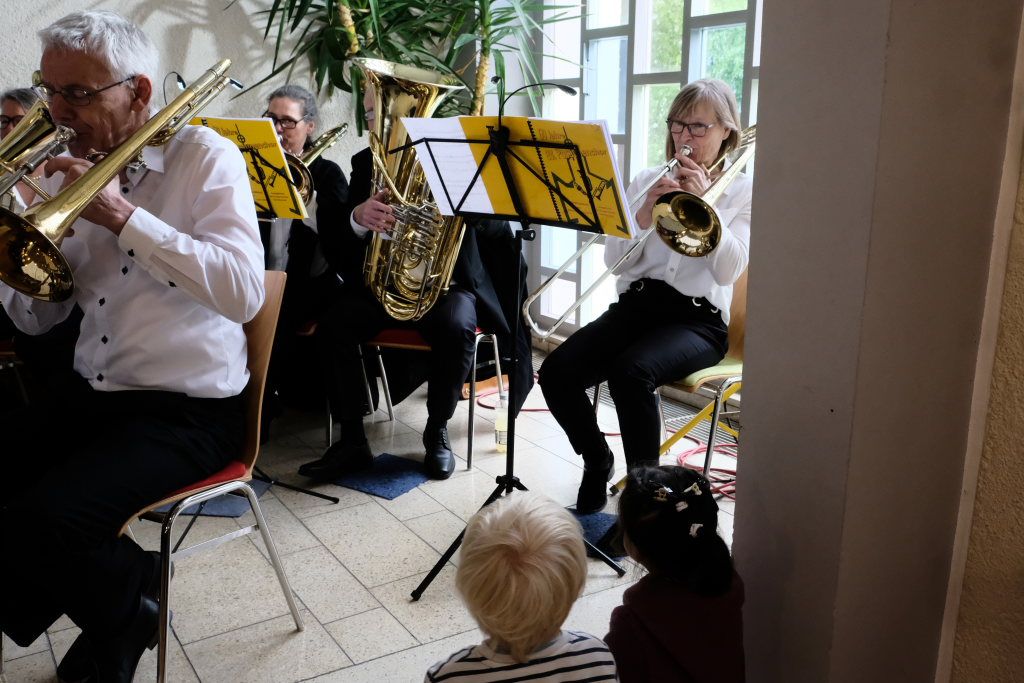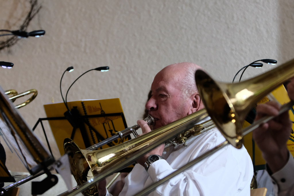Theo Klein durfte noch ein wenig zu Entstehung des Chores erzählen, den er gemeinsam mit Richard Schraag und dessen Söhne Friedrich und Eberhard aus der Taufe gehoben hatte. Da war zum einen die Schwierigkeiten mit der Instrumentenbeschaffung und dem fehlenden Personal. Dann war es auch eine mühsame Geschichte die Instrumente zu beherrschen, denn eine Musikschule, die dem Chor gut ausgebildete Jungmusikanten zur Verfügung stellte, gab es damals ja nicht. Aber er, Theo Klein, sei schon immer ein Sturkopf gewesen, und was er sich in den Kopf gesetzt hatte, das zog er durch: Nach dem ersten Vorspiel beim Pfarrer, der ihrem Spiel noch eine „holperige Qualität“ bescheinigte, wurde weiter geübt, um das Ziel, den Ostergottesdienst mit ihrem Spiel zu bereichern, zu erreichen.