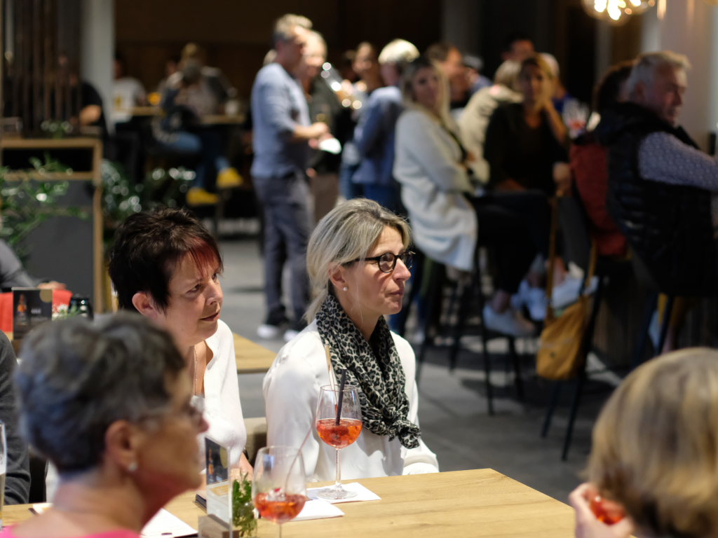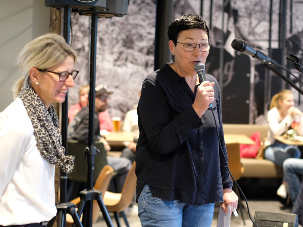 Gastgeberin Petra Springer begrüße das Publikum. Aufgrund schlechter Wetterprognosen war das Sommerabendkonzert recht kurzfristig vom Platz am Musikpavillon ins Restaurant „Torfstecher“ verlegt worden.
