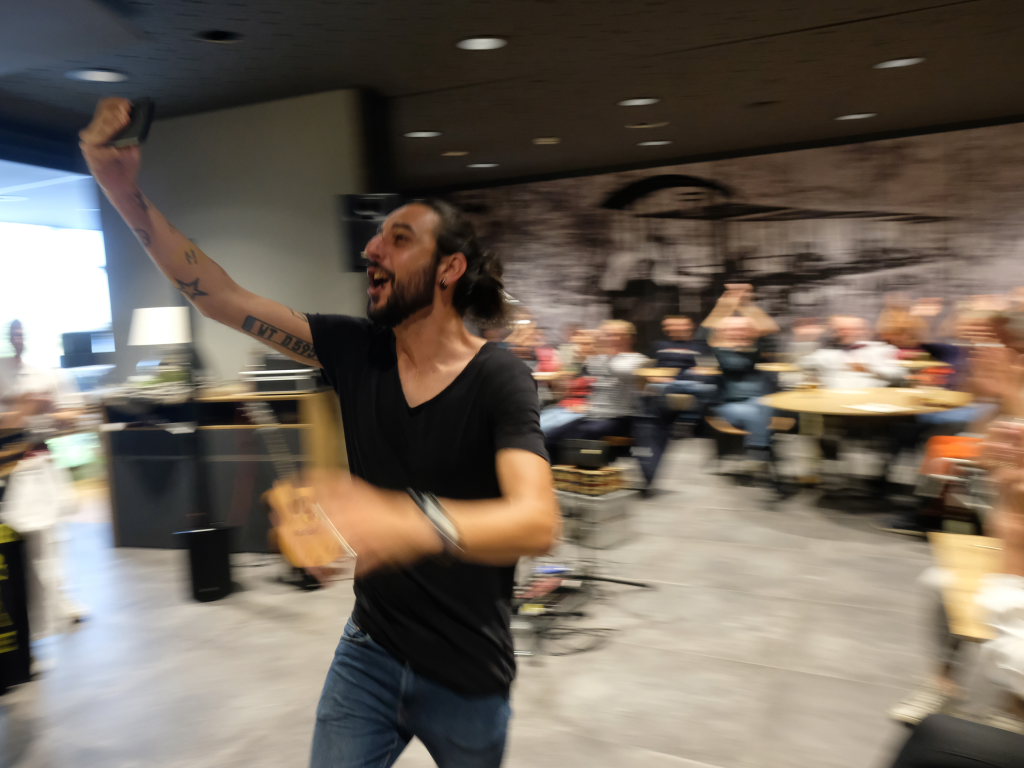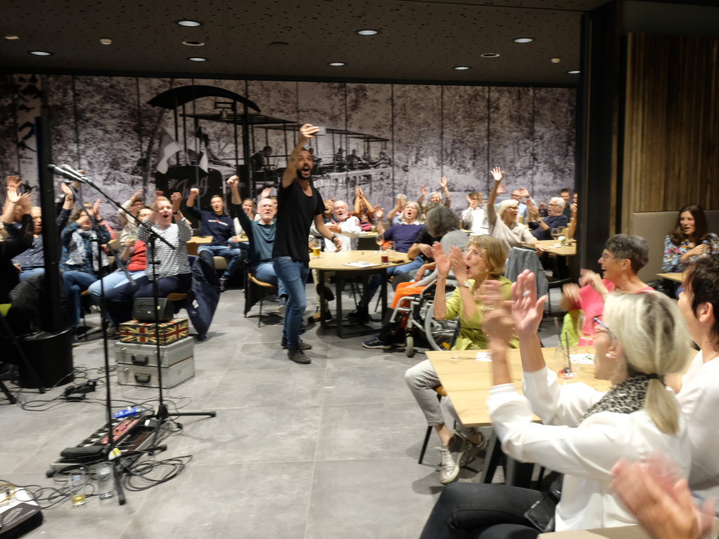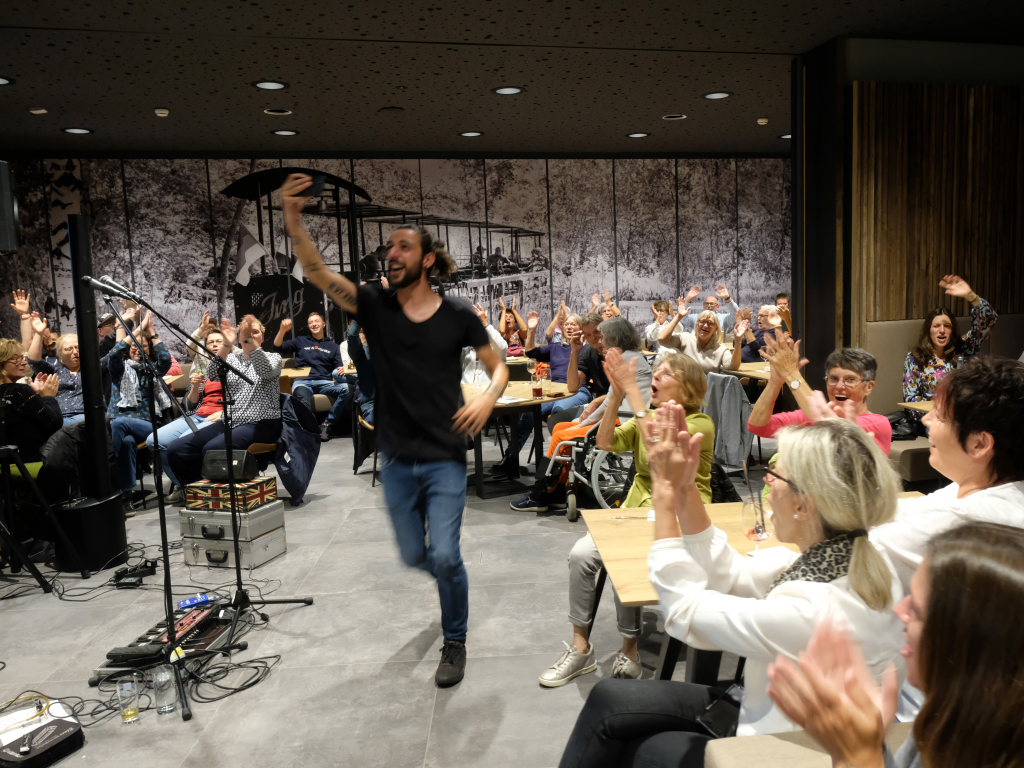 Dass Aljosha Konter topfit ist, zeigte er auch am Ende seiner schnelleren Stücke: Wie große Rockstars beendete er sie mit Riesensprung. Das Konzert beendete Konter mit dem gnadenlosen Liebemachen-Mitsing-Hit „Marmor, Stein und Eisen bricht“ des unvergessenen Drafi Deutscher.