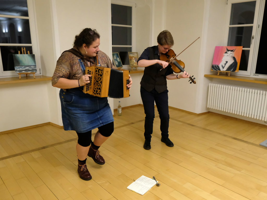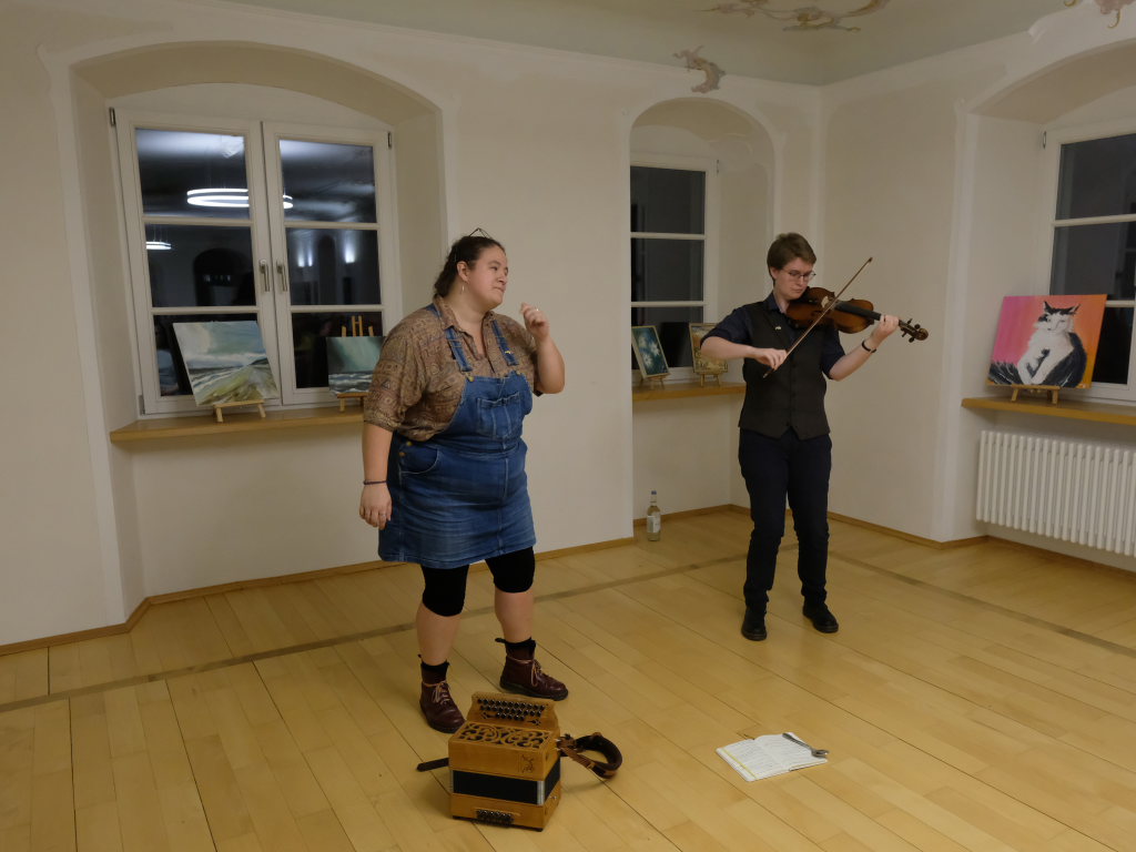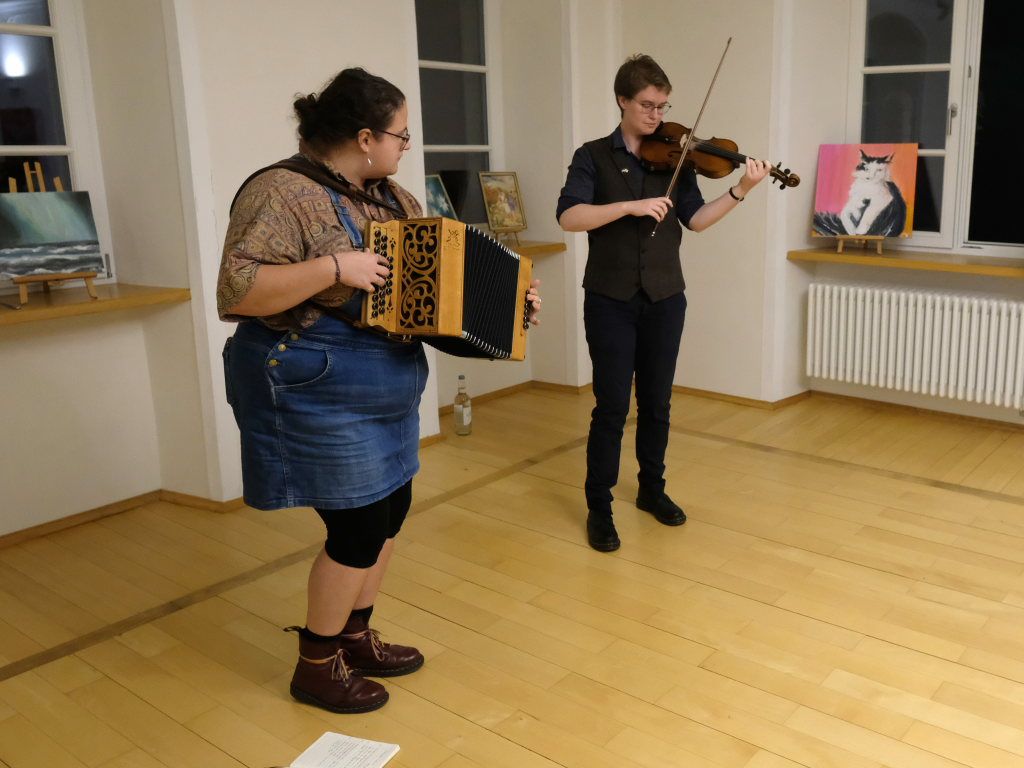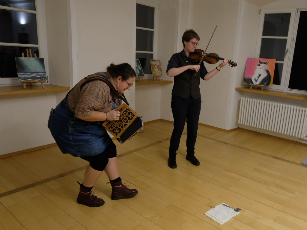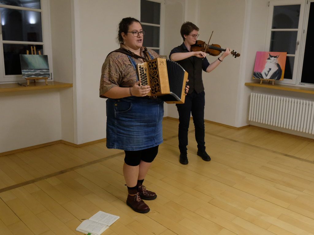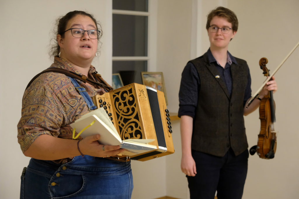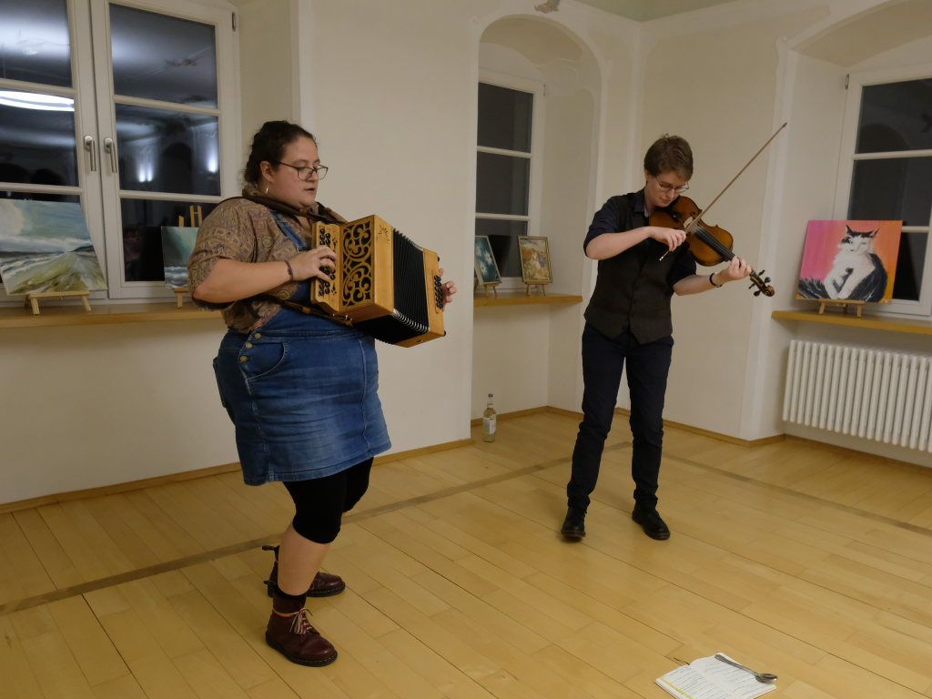 Das Duo nutzte diese Chance eindrucksvoll, die rund 60 Besucher spendeten begeisterten und auch spontanen Applaus bereits während der Stücke. Die beiden Musikerinnen von der Kanalinsel Guernsey Annie Blin-Bolt: Melodeon, und Gesang und Bethany Geoghegan: Geige und Gesang spielen energiegeladene und aufregende Musik in der englischen Folk-Tradition und neue, von der Insel (wie sie ihr Zuhause nennen) inspirierte Melodien. Die beiden haben sich während ihres Musikstudiums kennengelernt und begannen damals, regelmäßig gemeinsam aufzutreten. Während Corona spielten sie Online-Konzerte per Livestream oder solche, die auf Online-Musikfestivals übertragen wurden. Das Duo kombiniert dabei Geige und Melodeon, mal instrumental oder mit Gesang zu einem spannenden Mix, der annähernd alle Bereiche der englischen Folkmusic umfasst.