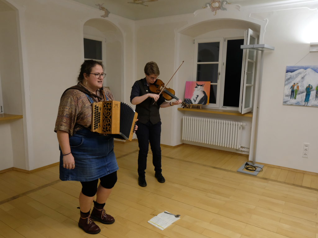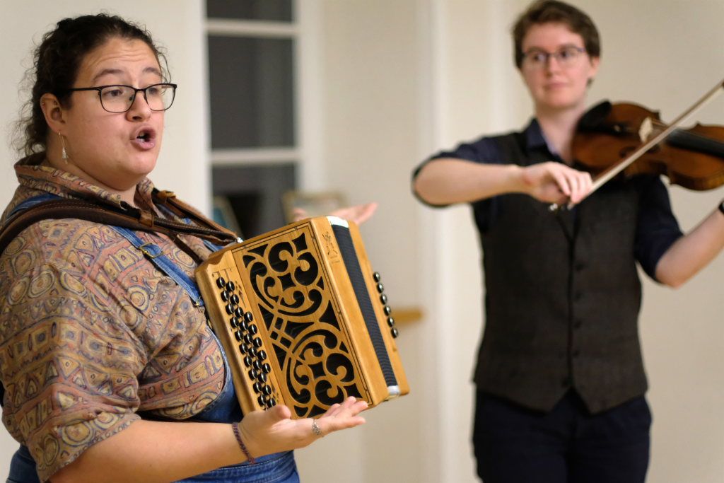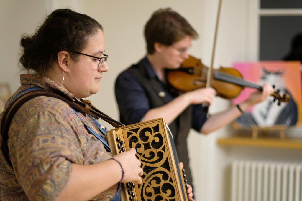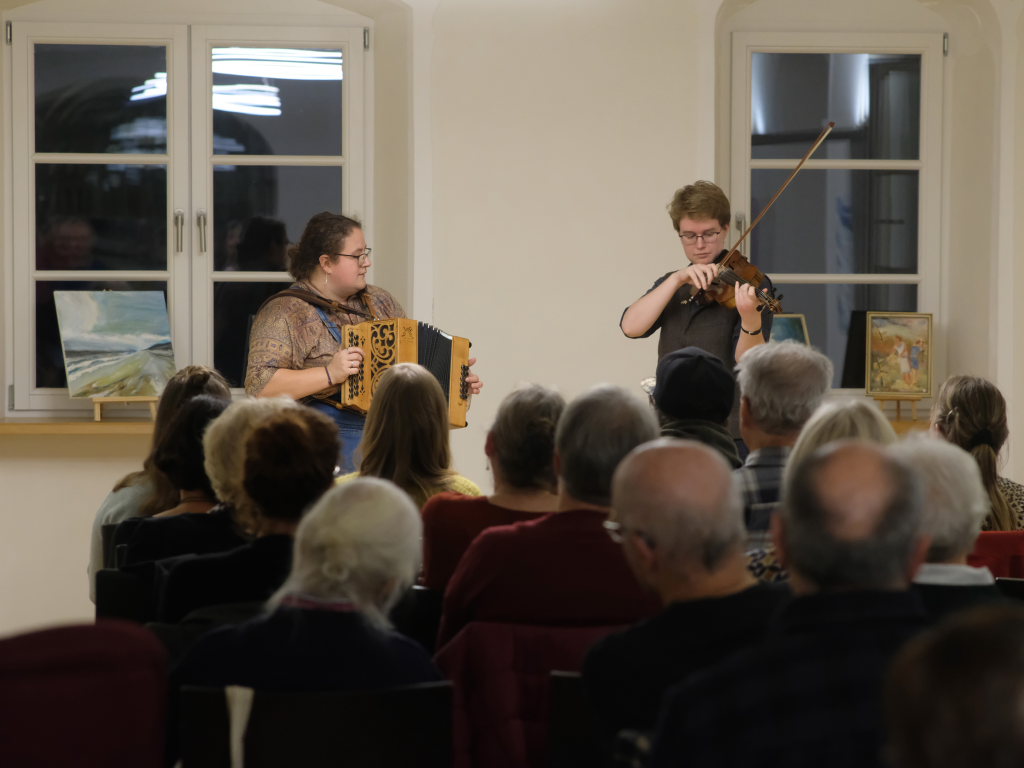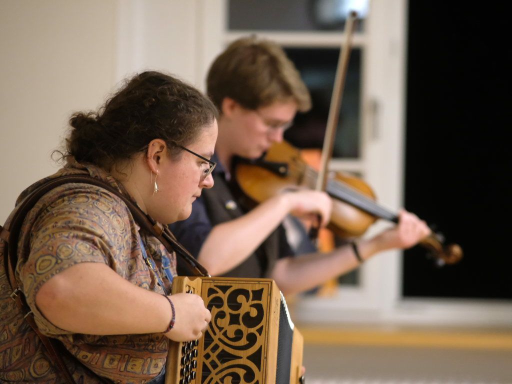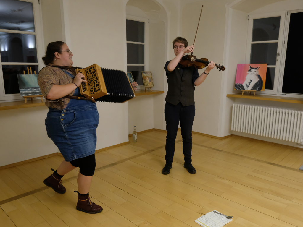 Das Duo nutzte diese Chance eindrucksvoll, die rund 60 Besucher spendeten begeisterten und auch spontanen Applaus bereits während der Stücke. Die beiden Musikerinnen von der Kanalinsel Guernsey Annie Blin-Bolt: Melodeon, und Gesang und Bethany Geoghegan: Geige und Gesang spielen energiegeladene und aufregende Musik in der englischen Folk-Tradition und neue, von der Insel (wie sie ihr Zuhause nennen) inspirierte Melodien. Die beiden haben sich während ihres Musikstudiums kennengelernt und begannen damals, regelmäßig gemeinsam aufzutreten. Während Corona spielten sie Online-Konzerte per Livestream oder solche, die auf Online-Musikfestivals übertragen wurden. Das Duo kombiniert dabei Geige und Melodeon, mal instrumental oder mit Gesang zu einem spannenden Mix, der annähernd alle Bereiche der englischen Folkmusic umfasst.