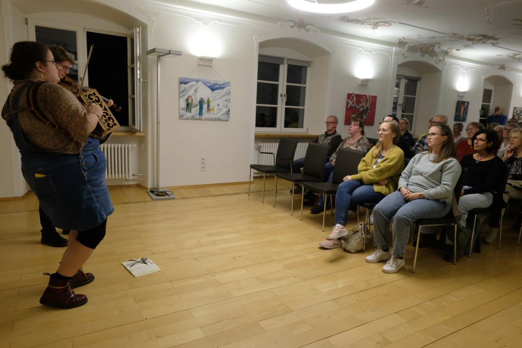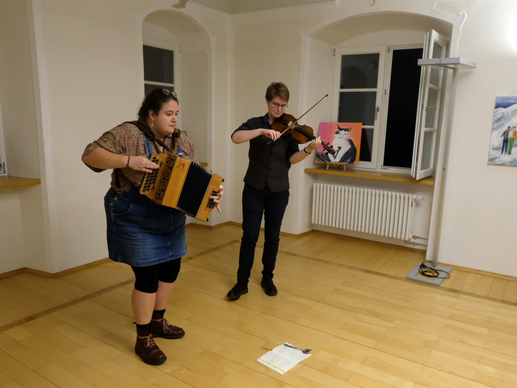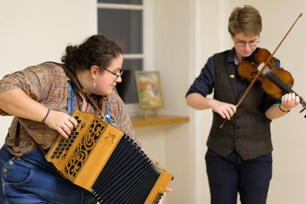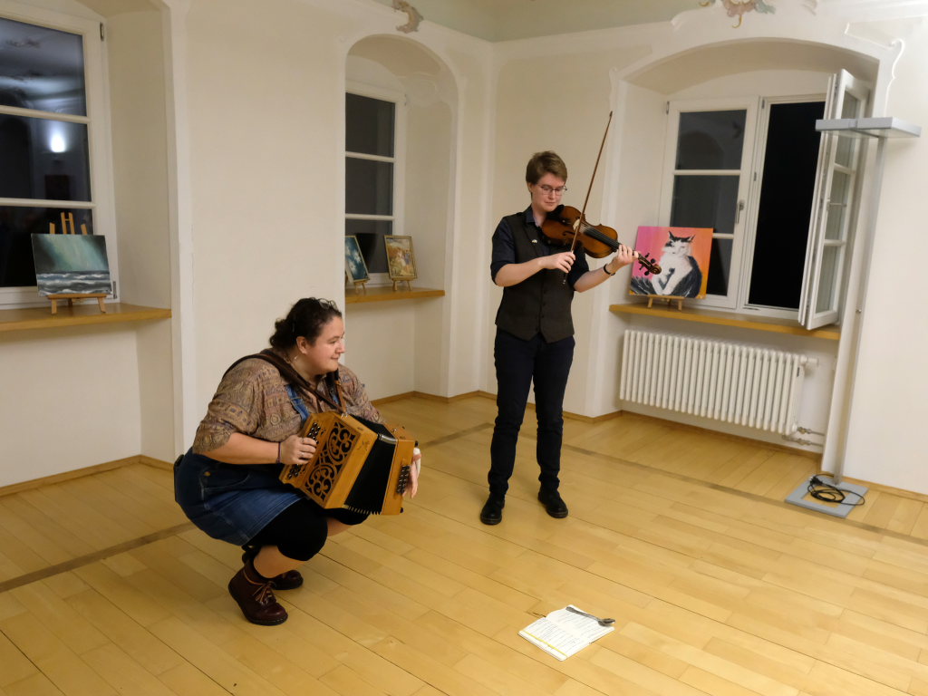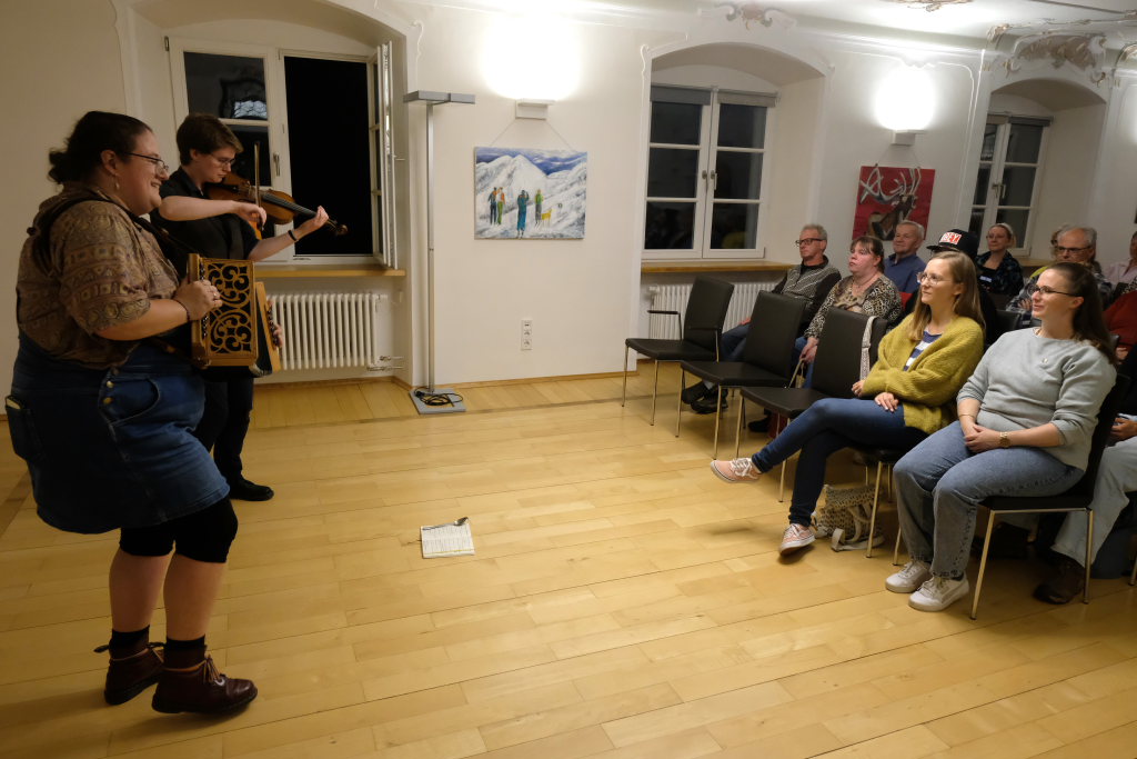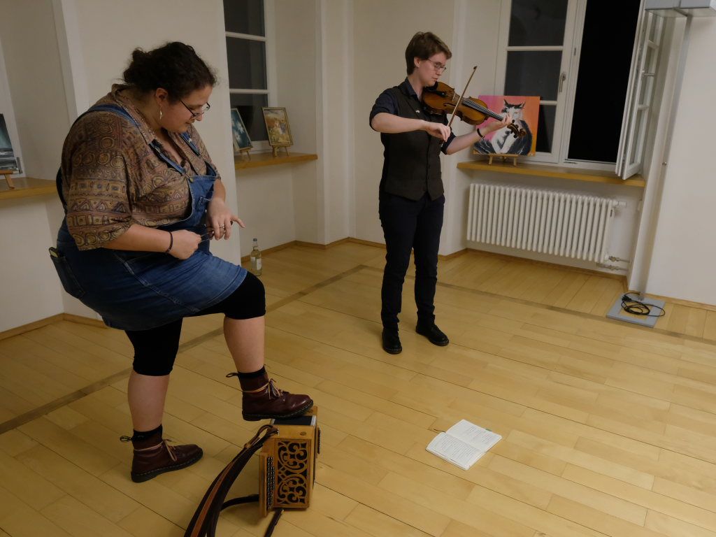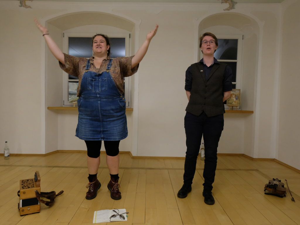 Das Duo nutzte diese Chance eindrucksvoll, die rund 60 Besucher spendeten begeisterten und auch spontanen Applaus bereits während der Stücke. Die beiden Musikerinnen von der Kanalinsel Guernsey Annie Blin-Bolt: Melodeon, und Gesang und Bethany Geoghegan: Geige und Gesang spielen energiegeladene und aufregende Musik in der englischen Folk-Tradition und neue, von der Insel (wie sie ihr Zuhause nennen) inspirierte Melodien. Die beiden haben sich während ihres Musikstudiums kennengelernt und begannen damals, regelmäßig gemeinsam aufzutreten. Während Corona spielten sie Online-Konzerte per Livestream oder solche, die auf Online-Musikfestivals übertragen wurden. Das Duo kombiniert dabei Geige und Melodeon, mal instrumental oder mit Gesang zu einem spannenden Mix, der annähernd alle Bereiche der englischen Folkmusic umfasst.