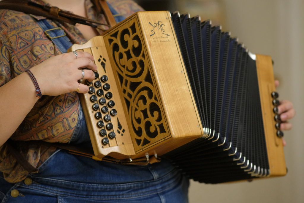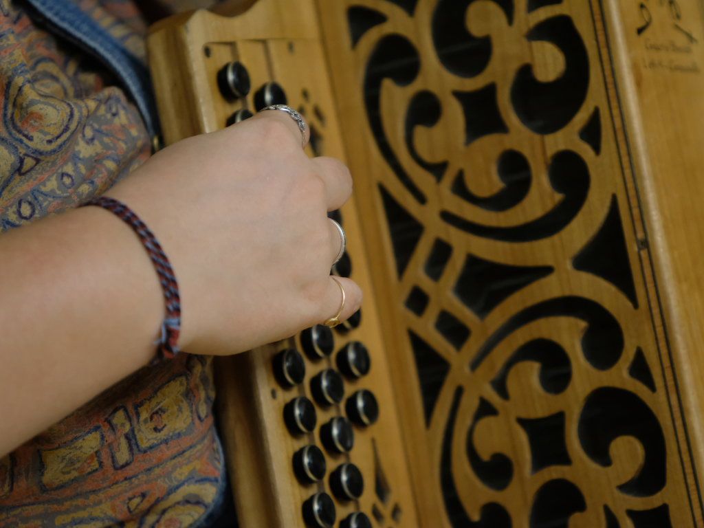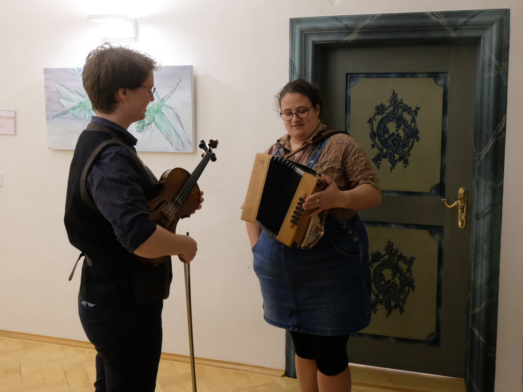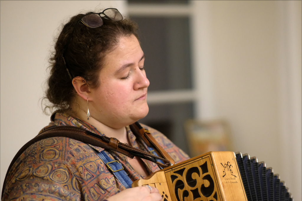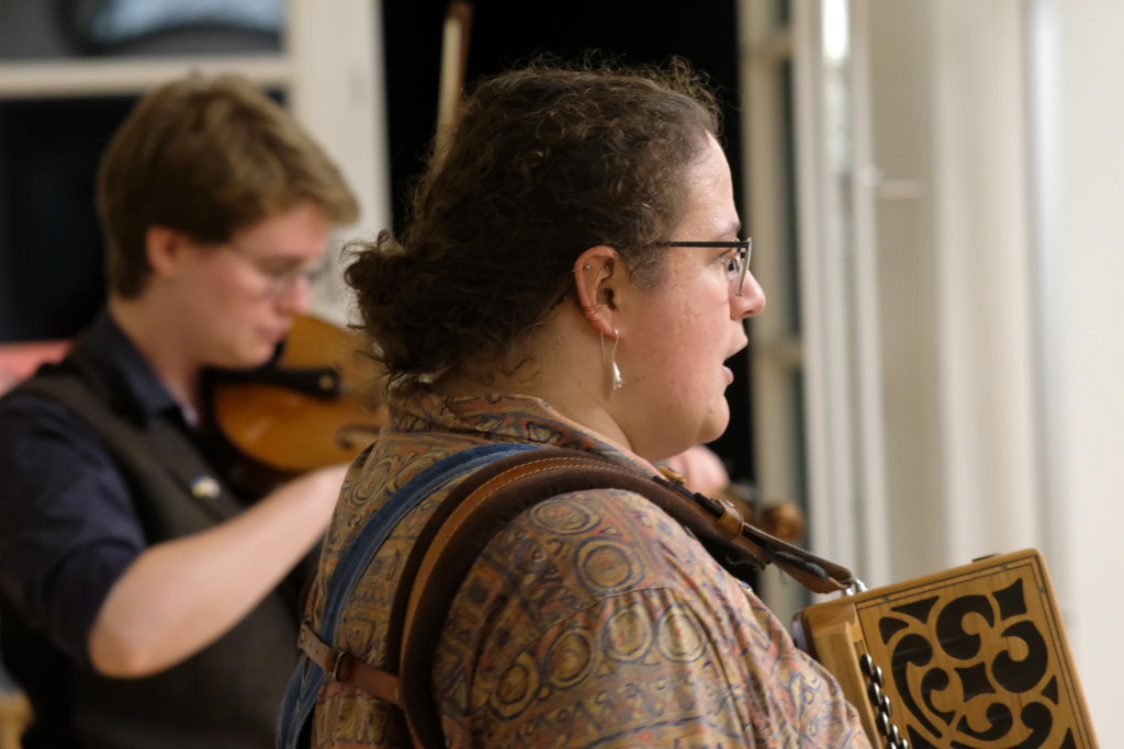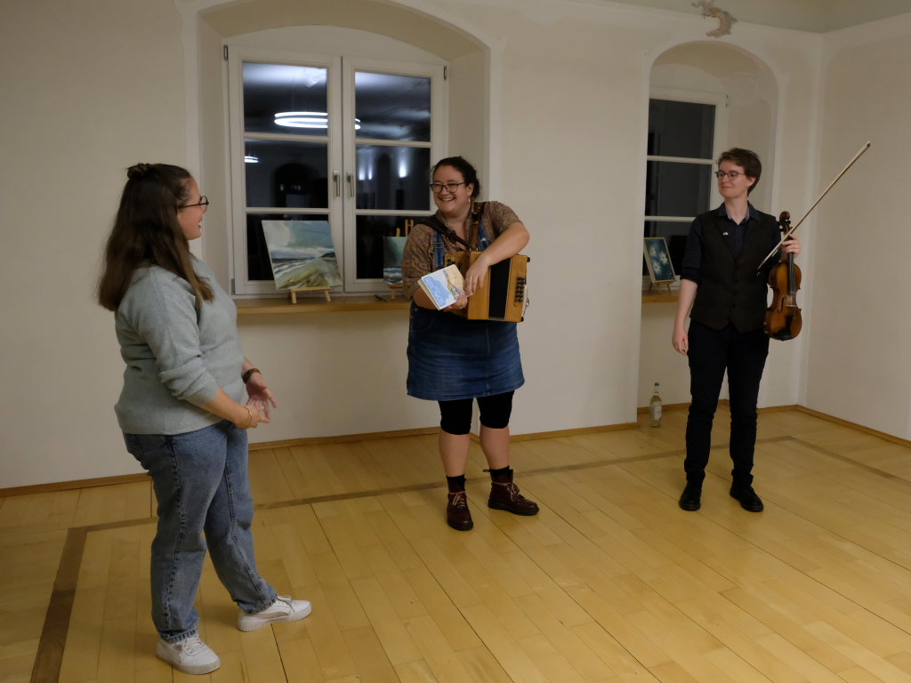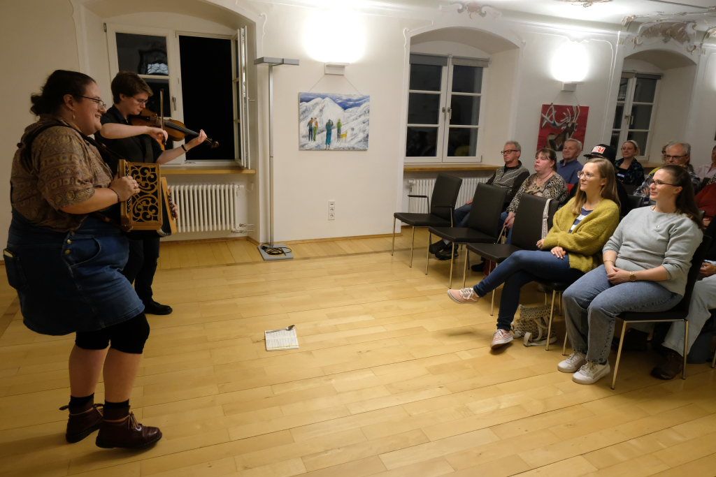 Das Duo nutzte diese Chance eindrucksvoll, die rund 60 Besucher spendeten begeisterten und auch spontanen Applaus bereits während der Stücke. Die beiden Musikerinnen von der Kanalinsel Guernsey Annie Blin-Bolt: Melodeon, und Gesang und Bethany Geoghegan: Geige und Gesang spielen energiegeladene und aufregende Musik in der englischen Folk-Tradition und neue, von der Insel (wie sie ihr Zuhause nennen) inspirierte Melodien. Die beiden haben sich während ihres Musikstudiums kennengelernt und begannen damals, regelmäßig gemeinsam aufzutreten. Während Corona spielten sie Online-Konzerte per Livestream oder solche, die auf Online-Musikfestivals übertragen wurden. Das Duo kombiniert dabei Geige und Melodeon, mal instrumental oder mit Gesang zu einem spannenden Mix, der annähernd alle Bereiche der englischen Folkmusic umfasst.