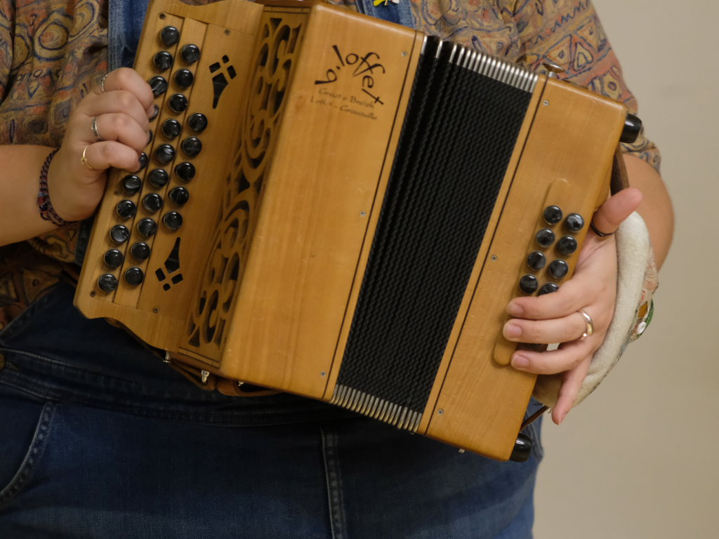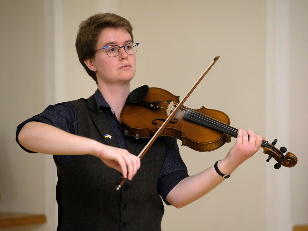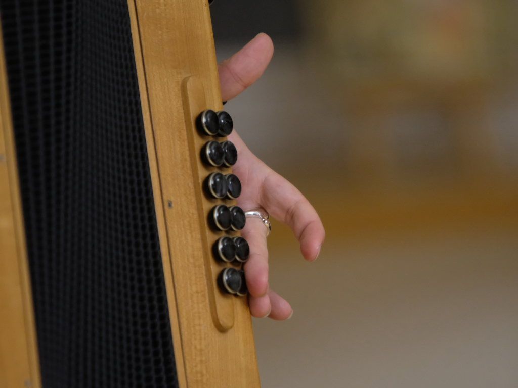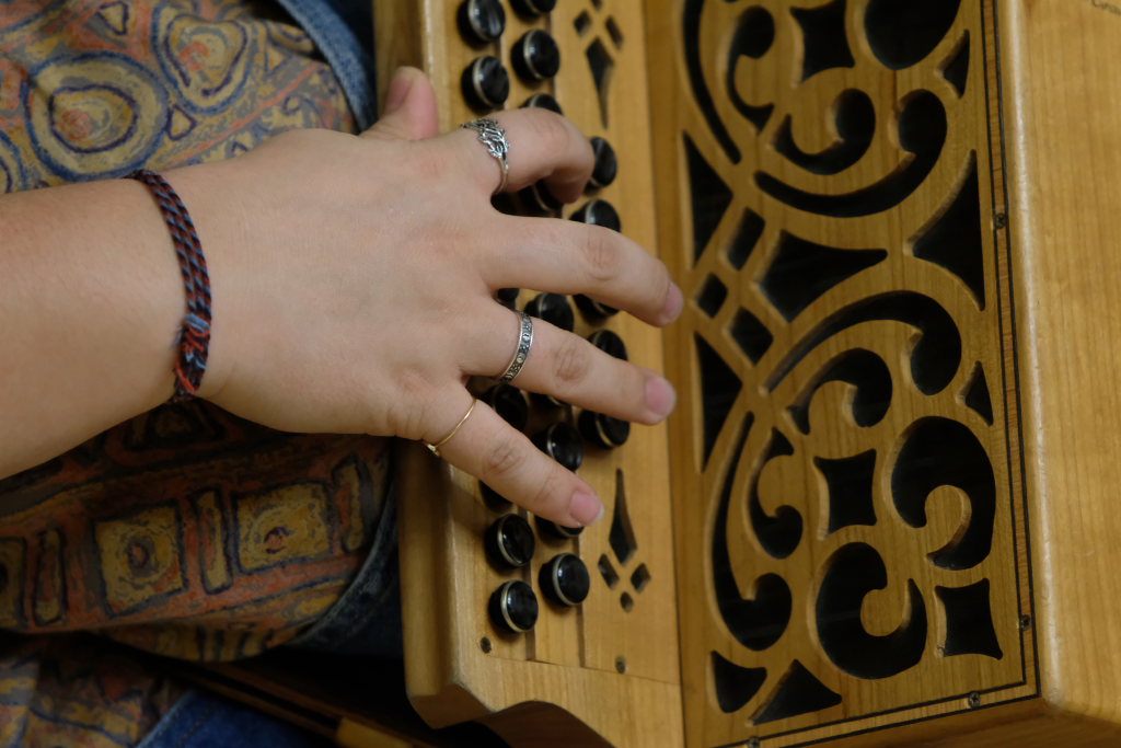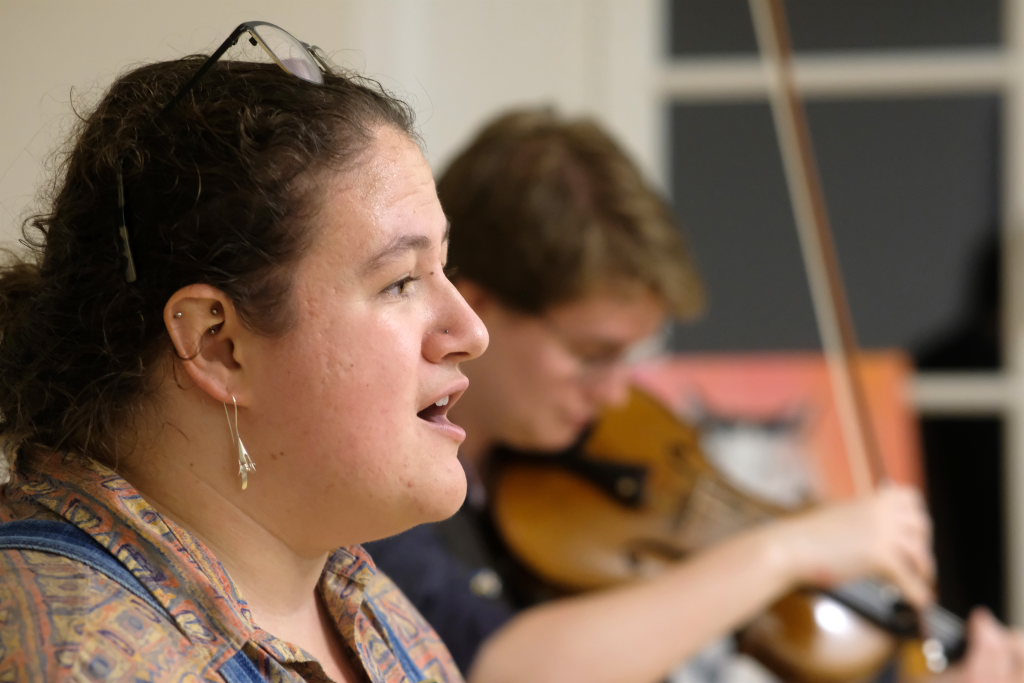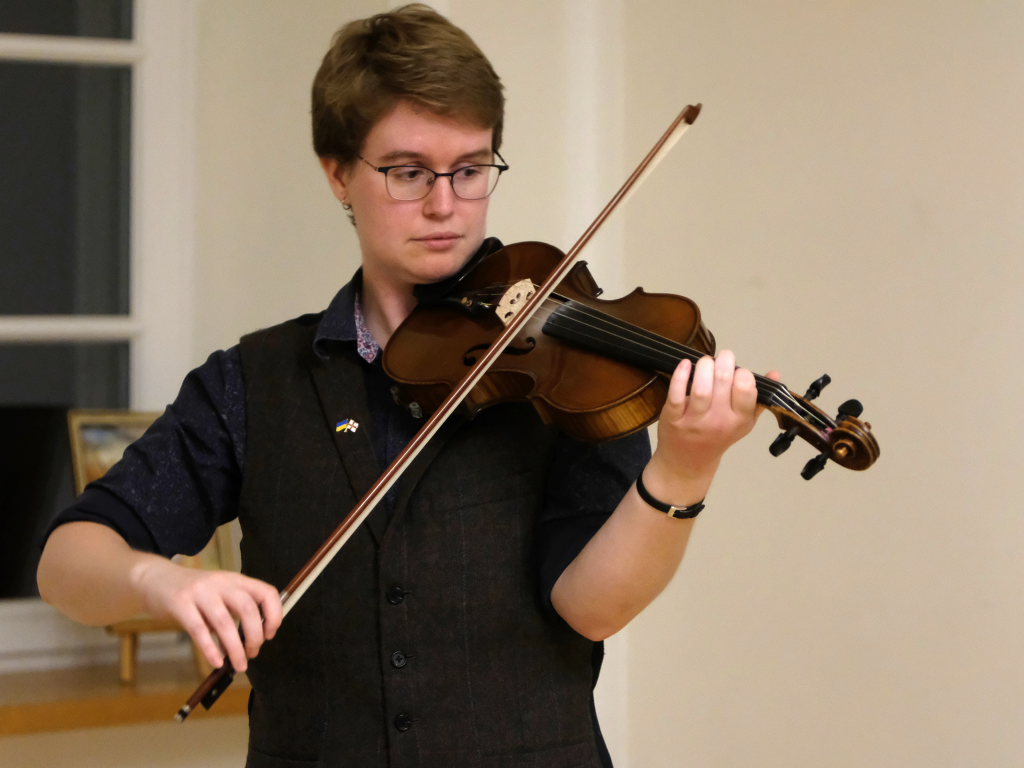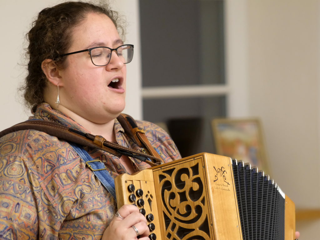 Das Duo nutzte diese Chance eindrucksvoll, die rund 60 Besucher spendeten begeisterten und auch spontanen Applaus bereits während der Stücke. Die beiden Musikerinnen von der Kanalinsel Guernsey Annie Blin-Bolt: Melodeon, und Gesang und Bethany Geoghegan: Geige und Gesang spielen energiegeladene und aufregende Musik in der englischen Folk-Tradition und neue, von der Insel (wie sie ihr Zuhause nennen) inspirierte Melodien. Die beiden haben sich während ihres Musikstudiums kennengelernt und begannen damals, regelmäßig gemeinsam aufzutreten. Während Corona spielten sie Online-Konzerte per Livestream oder solche, die auf Online-Musikfestivals übertragen wurden. Das Duo kombiniert dabei Geige und Melodeon, mal instrumental oder mit Gesang zu einem spannenden Mix, der annähernd alle Bereiche der englischen Folkmusic umfasst.