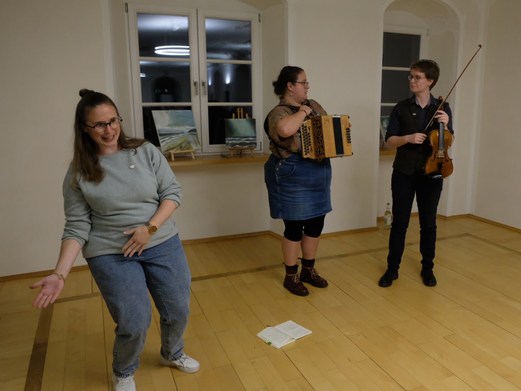 Auf den Morris-Dance verzichtete Anne Blin-Bolt in diesem Jahr zwar, der „To Town with a Pushang“ heißt und der von den BELLES AND BROOMSTICKS-Morris Dancers im Jahre 2020 auf Guernsey kreiert wurde. Diesen kennenzulernen hatten Interessierte in der Vorwoche im Rahmen eines Workshops Gelegenheit in Biberach. Dennoch konnte jeder im Saal die Energie spüren, die von den Musikern ausging. Und mit „Regal Beaver“ hatten Bolt & Geoghegan auch ein Lied im Gepäck, das speziell den Biberacher Gastgebern gewidmet war. Aber auch das Publikum in Bad Wurzach wurde eingeladen, mitzusingen.