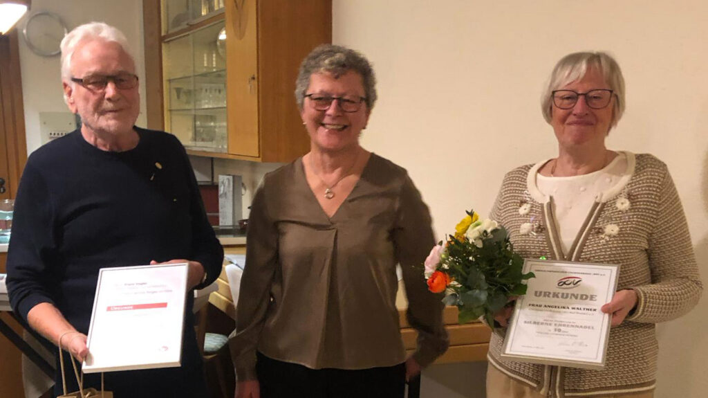 Franz Vogler wurde für 60 Jahre, Angelika Walther (rechts) für 30 Jahre aktives Singen geehrt. In der Mitte Andrea Ewert vom Oberschwäbischen Chorverband (OCV), die die Ehrungen vornahm. Foto: Regina Kuhn