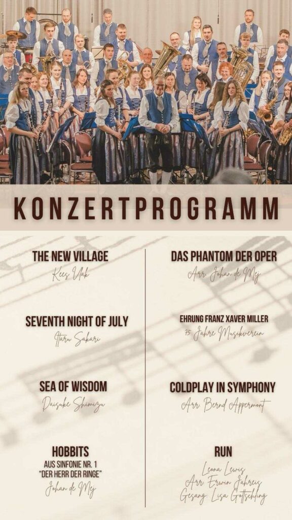 In der Einladung heißt es: Auch in diesem Jahr wollen wir Ihnen Blasmusikkompositionen aus verschiedenen Richtungen präsentieren. Unser Dirigent Berthold Hiemer hat hierfür ein anspruchsvolles Programm zusammengestellt und mit uns einstudiert. Näheres entnehmen Sie bitte dem beigefügten Programmblatt. Wir hoffen, dass auch für Sie etwas dabei ist und würden uns freuen, Sie an diesem Abend im Kurhaus in Bad Wurzach begrüßen zu dürfen.