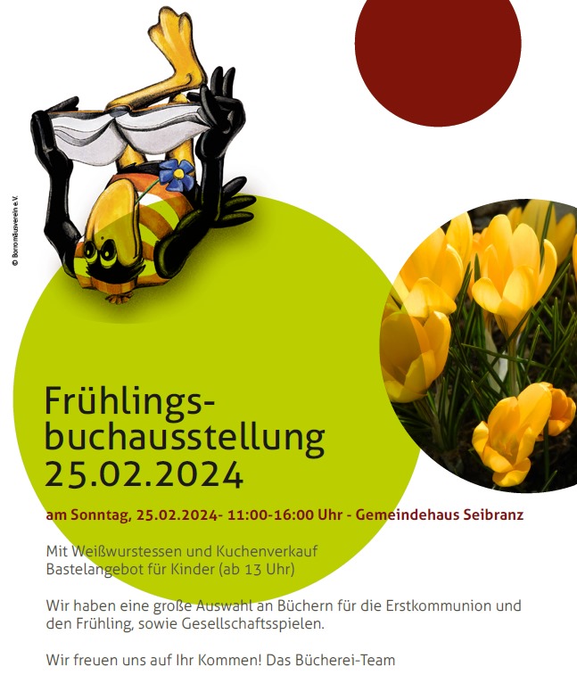 Seibranz – Am Sonntag, 25. Februar, findet ab 11.00 Uhr im Gemeindehaus Seibranz eine Frühlingsbuchausstellung statt. Auch für das leibliche Wohl ist bestens gesorgt.
