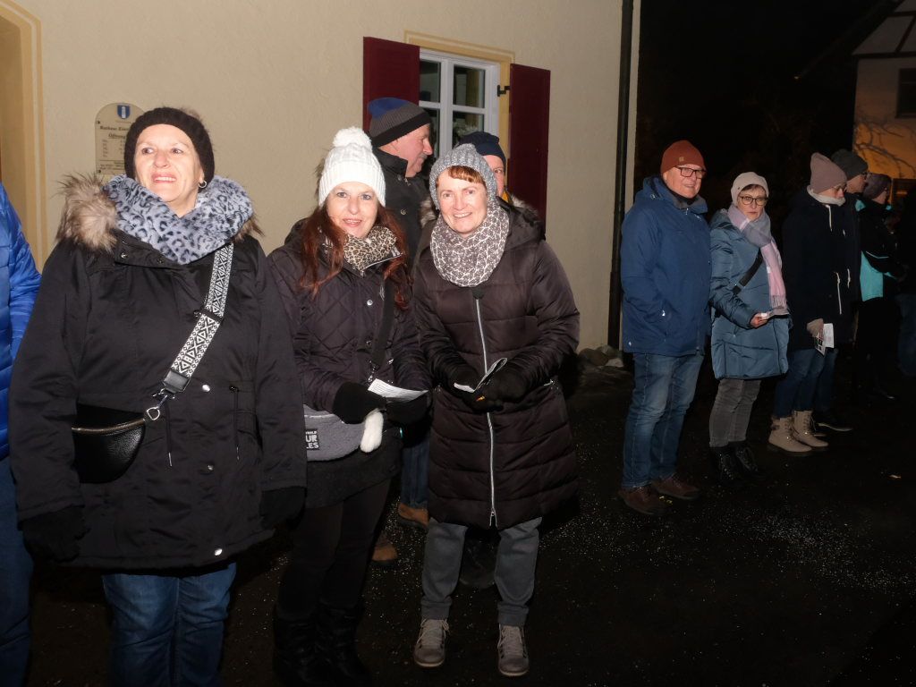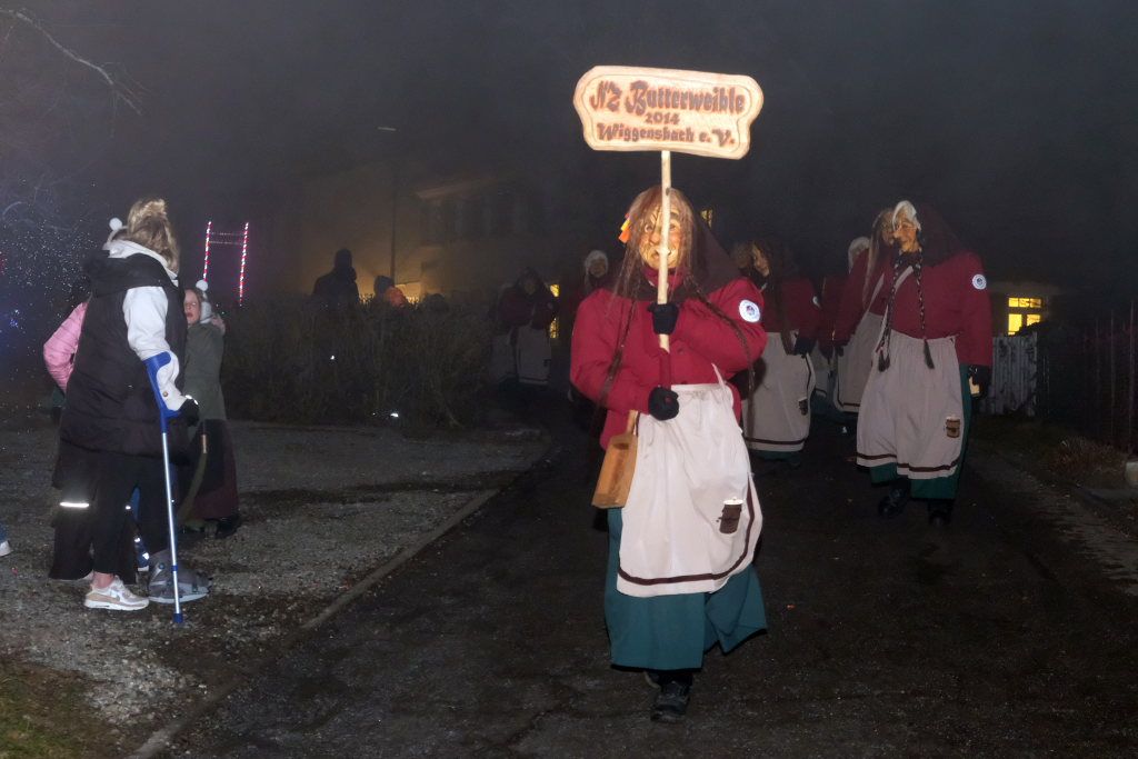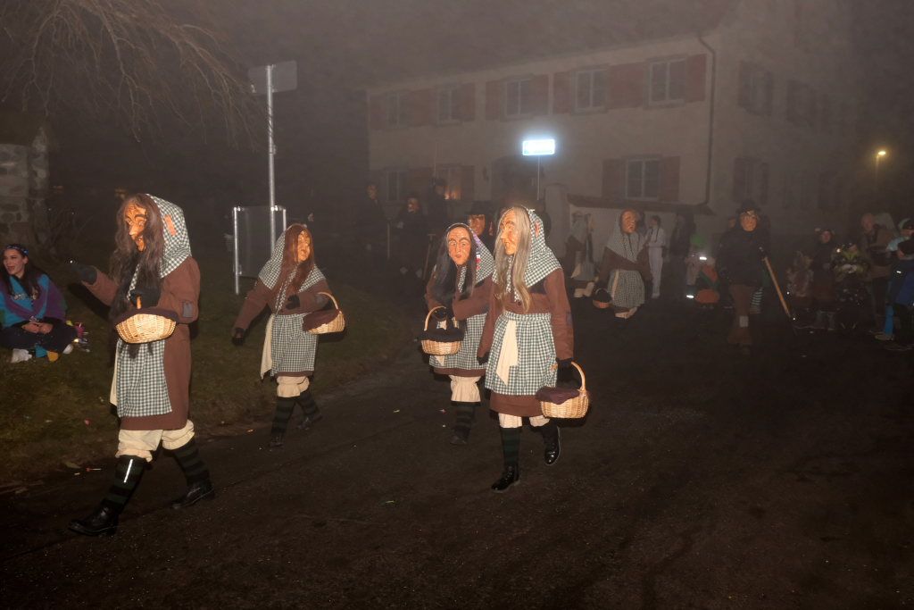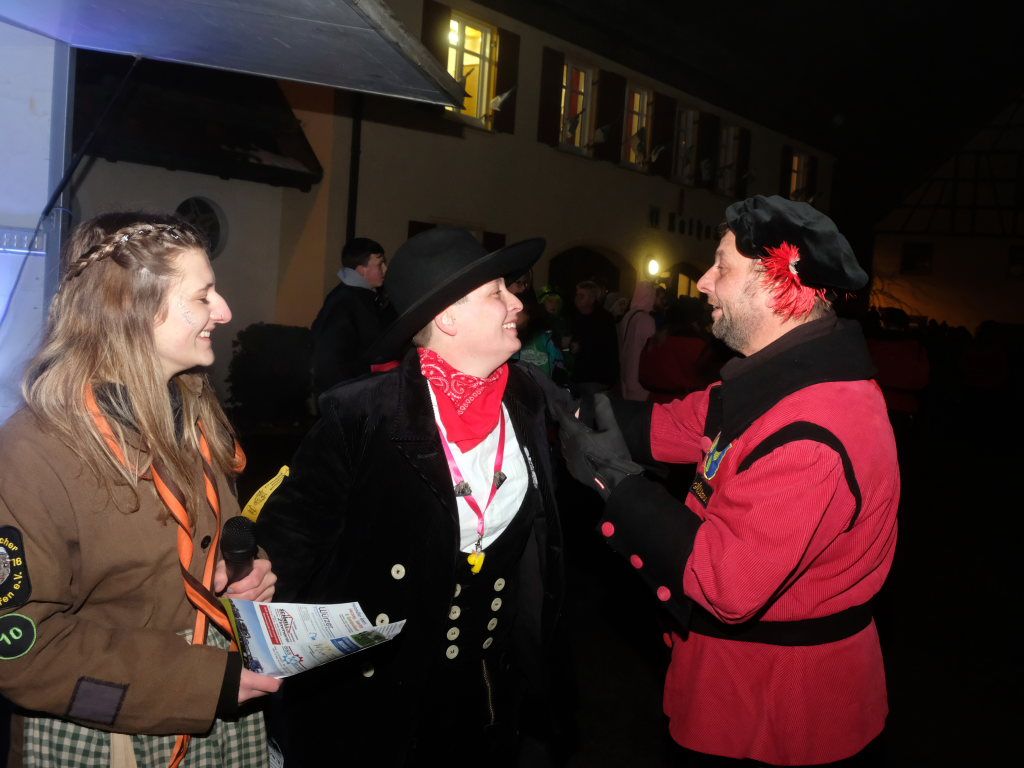 An der Ecke Pfarrhaus/ Kirche kommentierte Zunftmeisterin Christine Veser gemeinsam mit der gebürtigen Eintürnerin Annika Bodenmüller von den Waltershofenern Torfstechern das närrische Defileé. Die Zuschauer und Ansagerinnen bekamen nach den Höllteufeln es dann mit den Immenriedern Fehla samt dem dazugehörigen Teufel zu tun. Nach den ebenfalls noch aus der Region stammenden Allmishofener Feuerhexen bevölkerten die Hagsbergweible der Narrenzunft Butterweible aus Wiggensbach bei Kempten die Straße bei Kirche und Rathaus, die die Guggamusik Flachsheular aus Sonthofen in ihrem Schlepptau hatten.